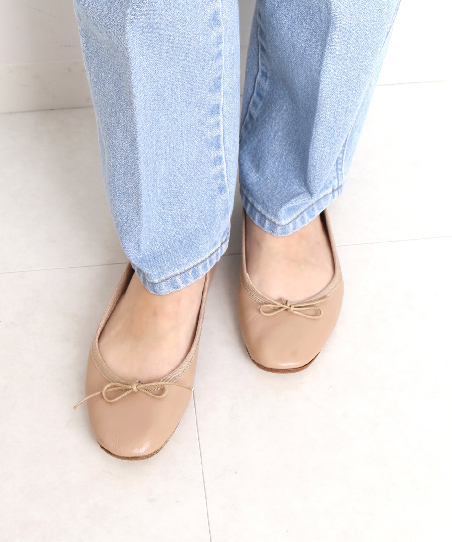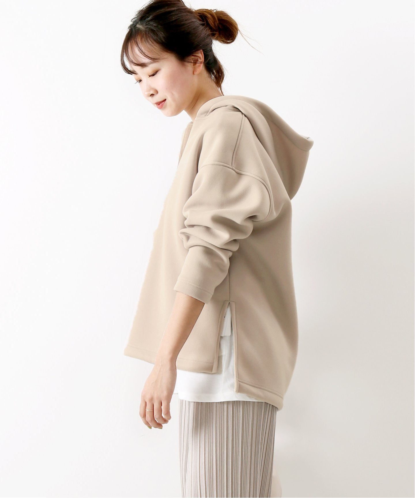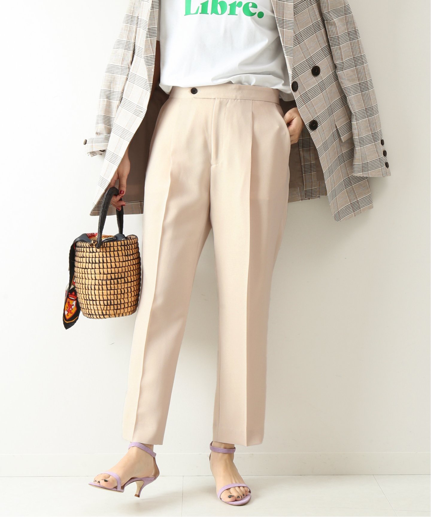 ベージュボトムス。