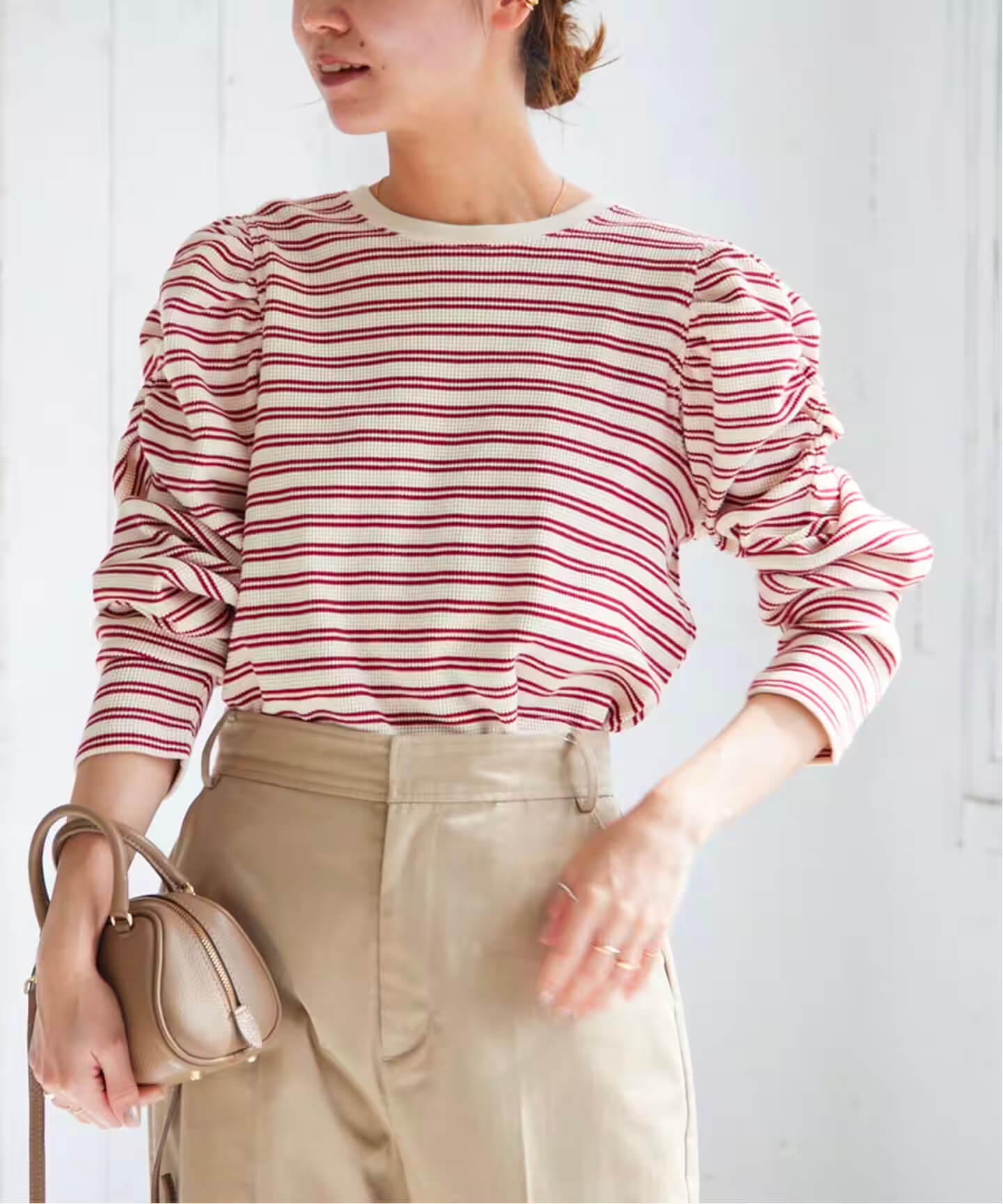 袖のボリュームで華やかにスウェットやボーダートップスなど、春のスタメンカットソーは着回しやすいシンプルさが大前提。そこに、さりげなく映えるボリュームスリーブやギャザーをプラス。