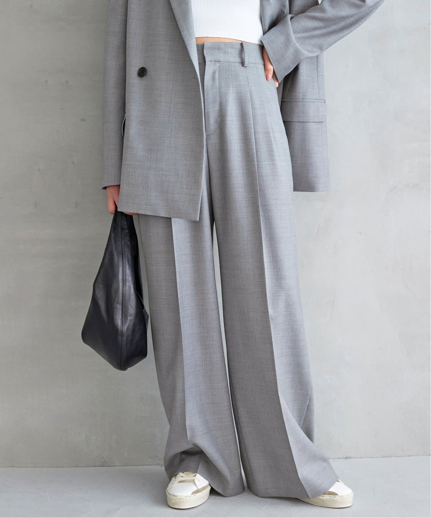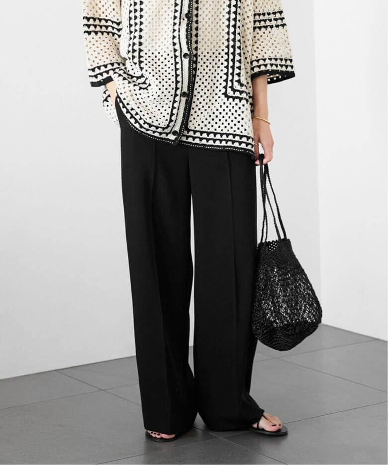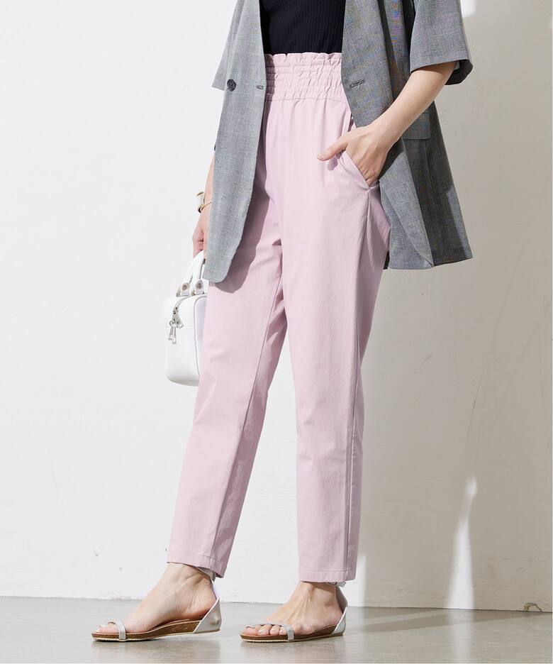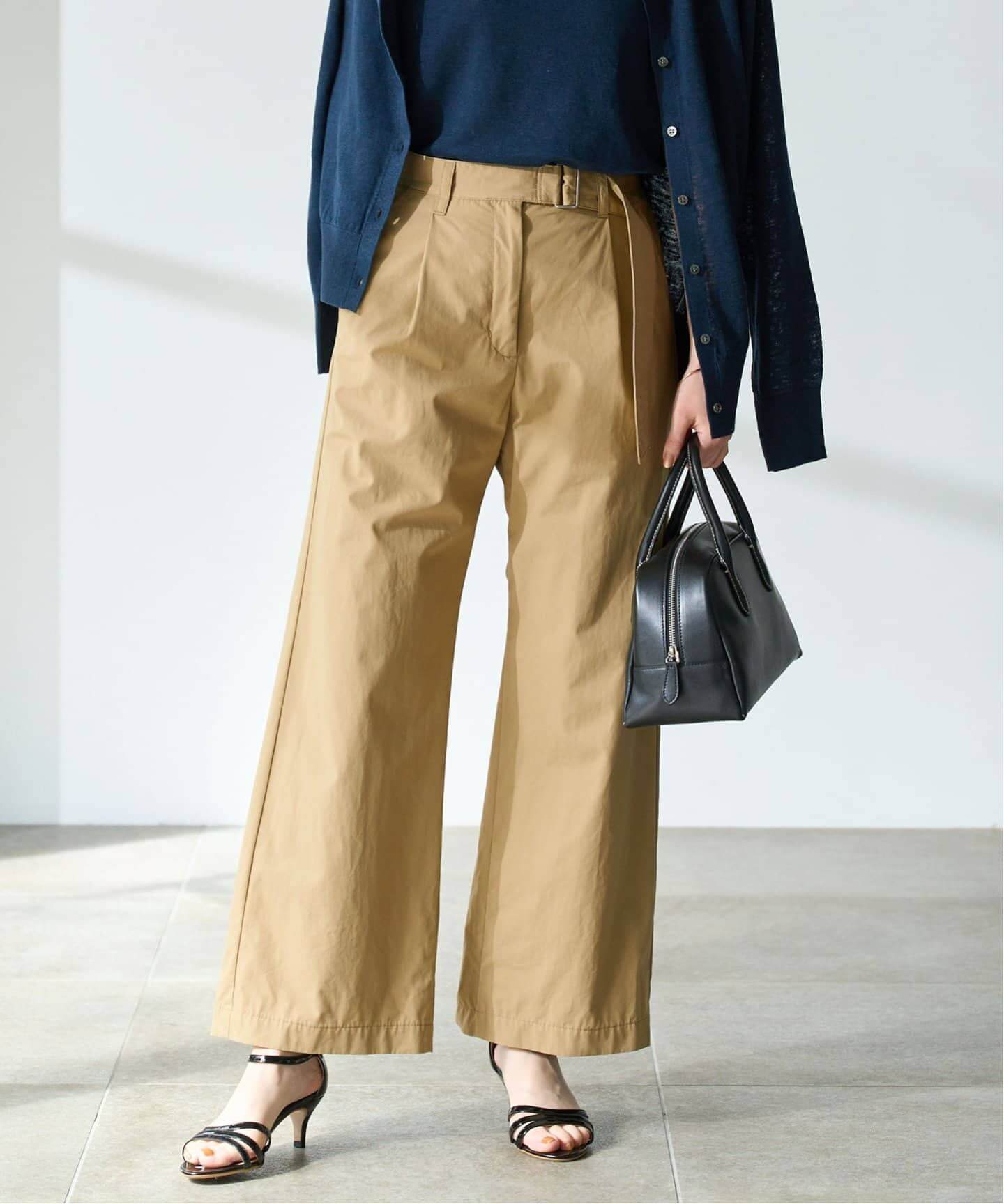 クールにこなれつつ、気負わないゆるさも感じさせるDeuxieme Classeのタックワイドパンツ。今年らしいきれいめベージュパンツはIENAのベルテッドパンツがおすすめ。