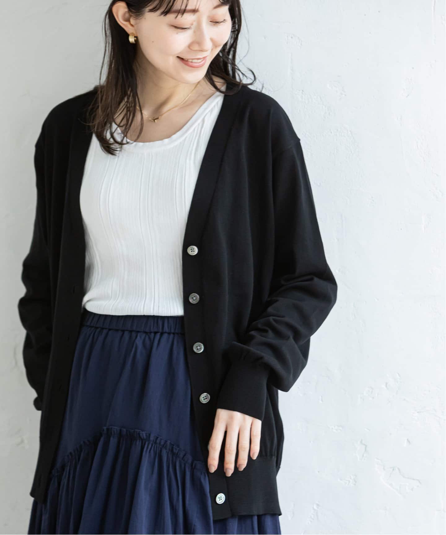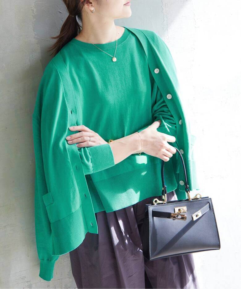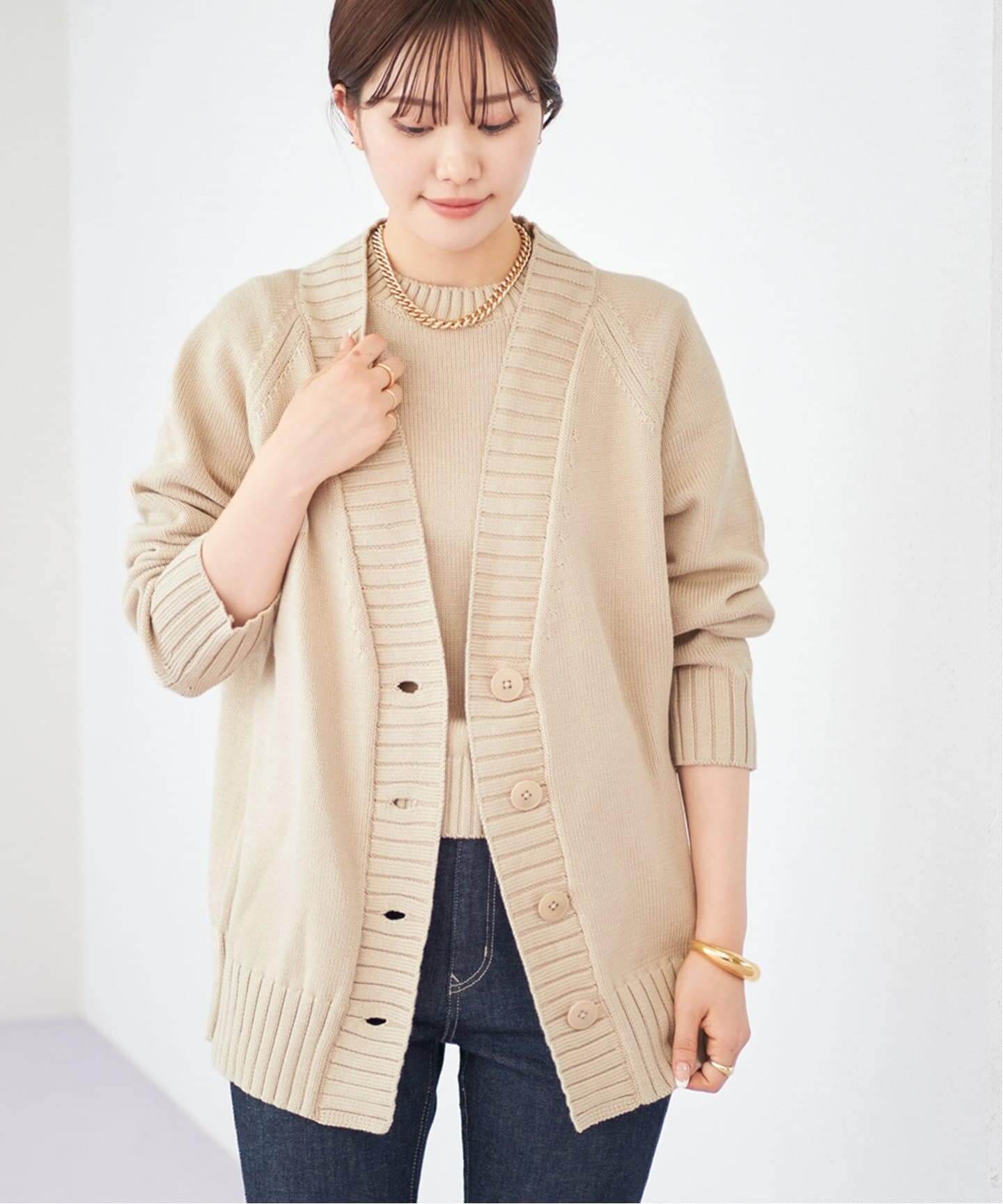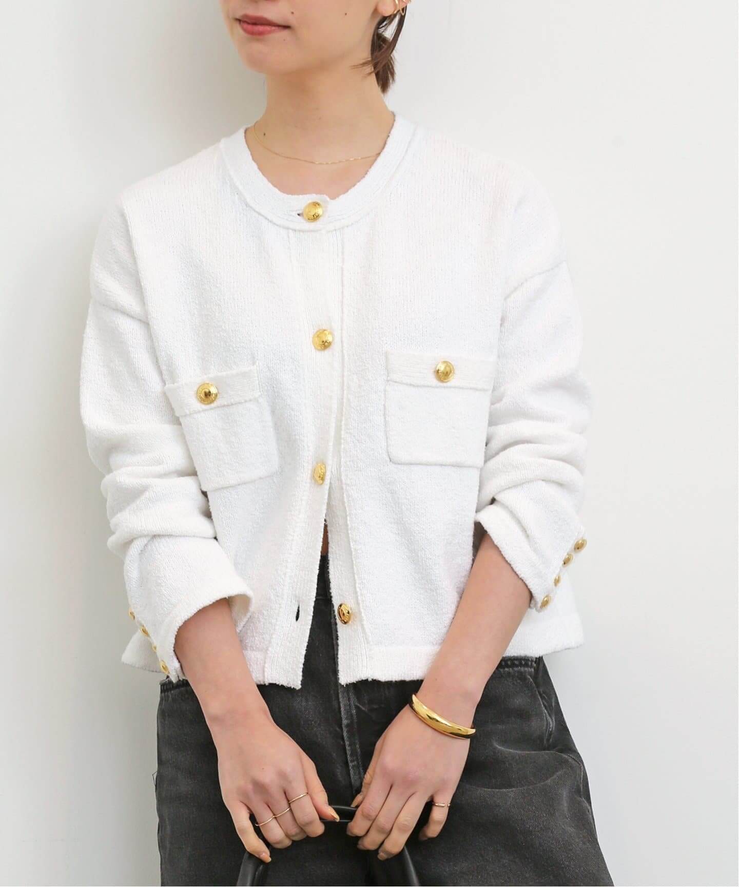 ラフに着こなすのが今年流まるでツイードのような素材感や、金ボタンのポケットなどのディテールがジャケットのような佇まいのカーディガン。あえてルーズなボトムスと合わせてラフに着こなして。