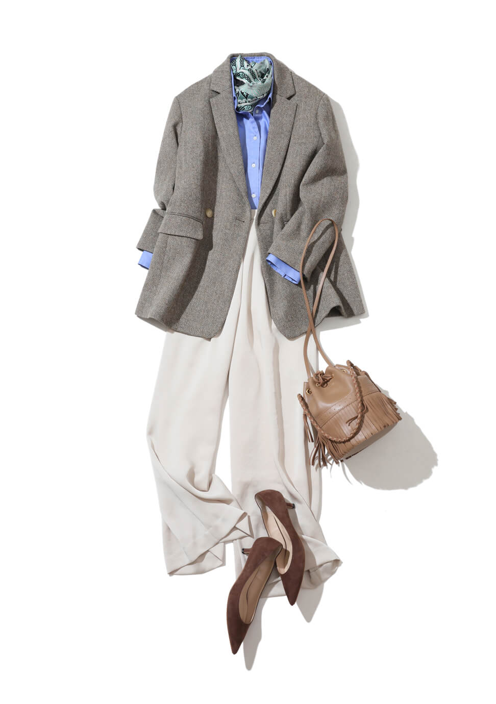 大切な取引先との重要なミーティングを控えている今日。シャツにワイドパンツ、仕上げにかっちりとしたテーラードジャケットを着て、全方位抜かりないオフィスコーデをメイク。とはいえ女らしい要素も忘れずに。首元にはスカーフで華を添えつつ、バッグとパンプスはブラウンで統一することで、大人の品格をアップさせて。 - IENAレギュラーカラーシャツ◆¥17,600(税込)