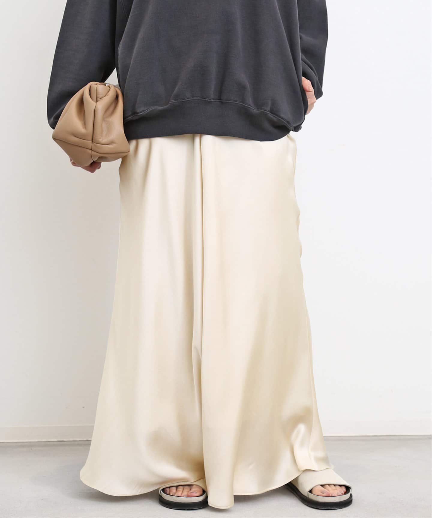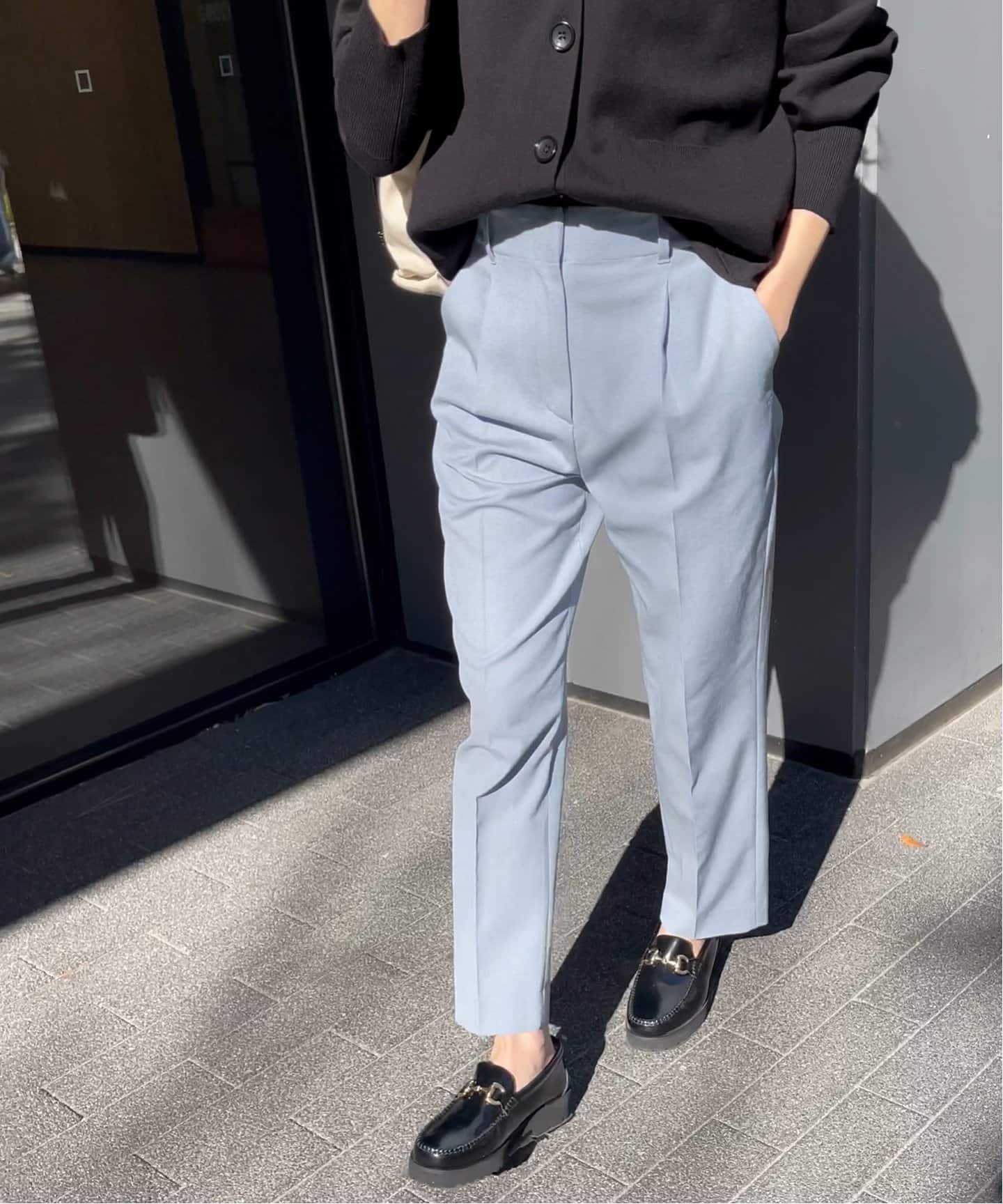 ツヤをまとって洗練感アップオン・オフでヘビロテ確実のマニッシュなテーパードパンツ。都会的なニュアンスが高まる光沢のある素材やカラーパンツが◎。甘スカートは、カジュアルな抜け感を意識して。