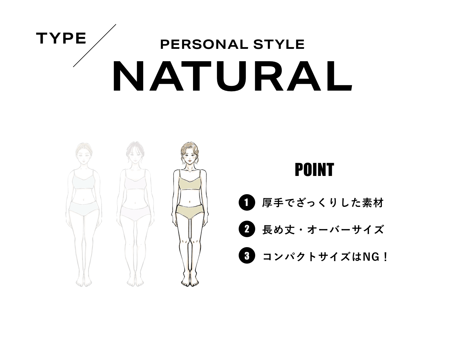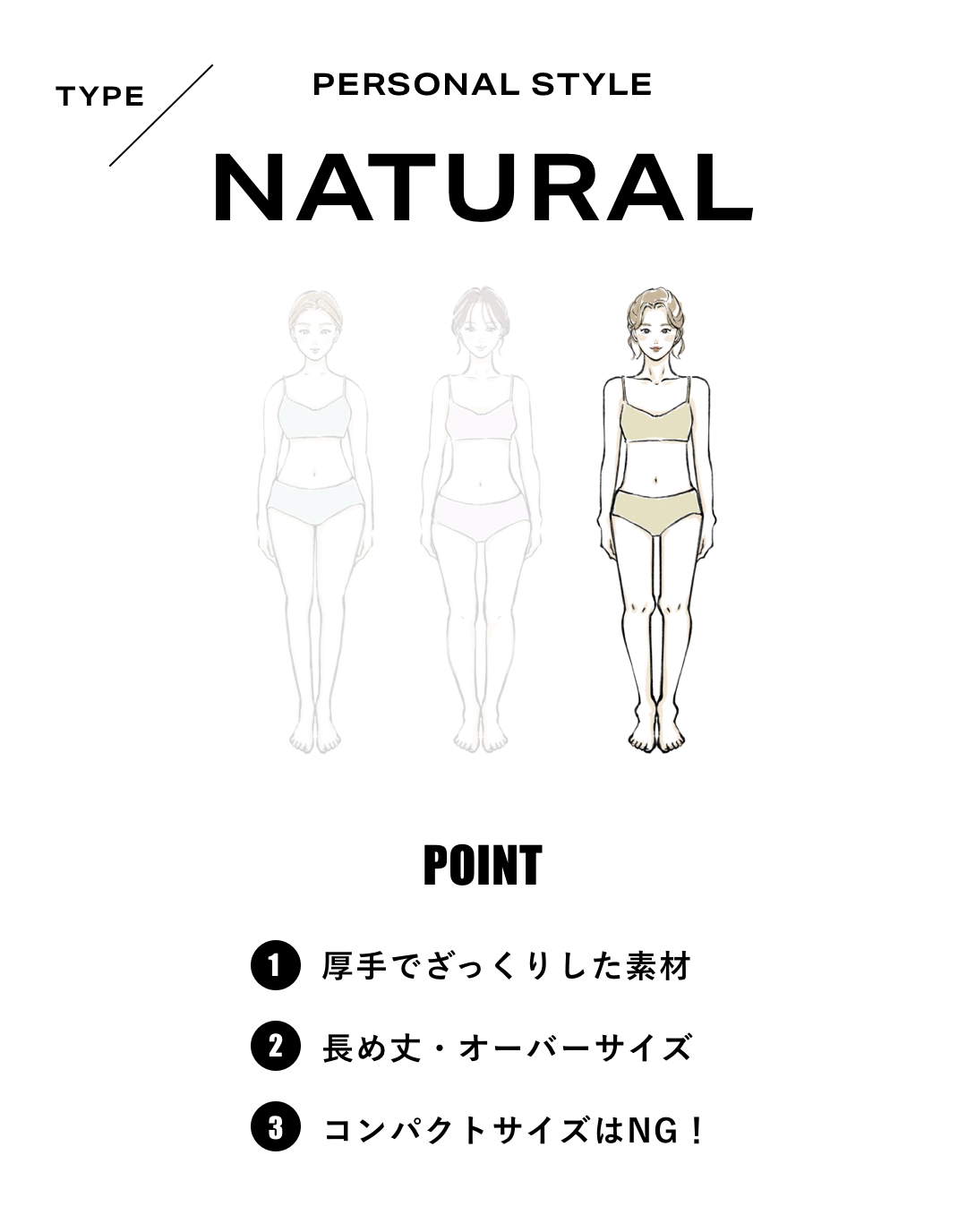 - 大きめ・長めのアイテムが似合うナチュラルタイプ。腰より短い丈のアウターはアンバランスになりがちなので、Plageの立体的なフォルムのショートブルゾンをチョイス。MA-1定番のカーキはオータムタイプのカラーなので、ネイビーやブラックがおすすめです。