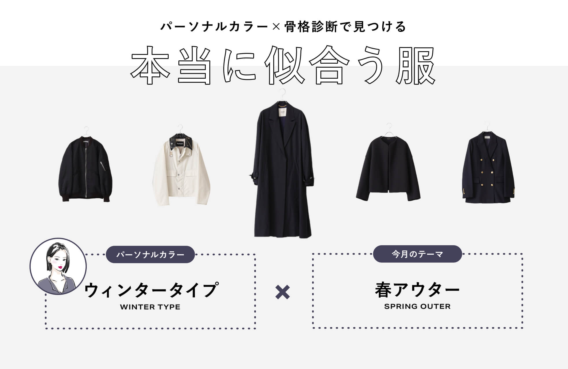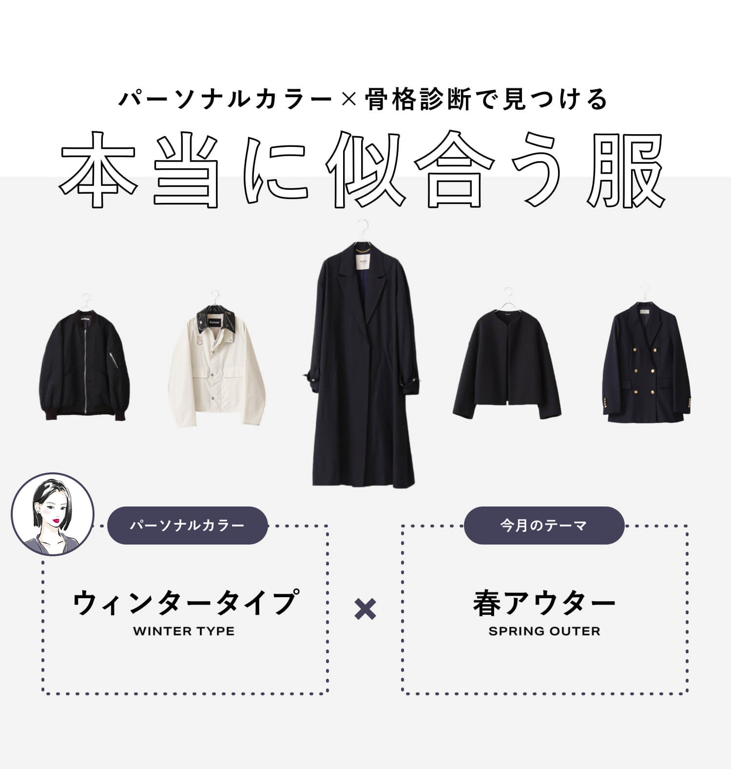 - カジュアルなフードコートはナチュラルタイプだからこそ着こなせるアイテム。ウィンタータイプは4タイプで唯一黒が似合うので、ロング丈でも重たくならずに着こなせます。VERMEILオリジナルのモノグラムロゴをあしらった変化球ブルゾンなら、スポーティーにモダンな雰囲気を上乗せ。