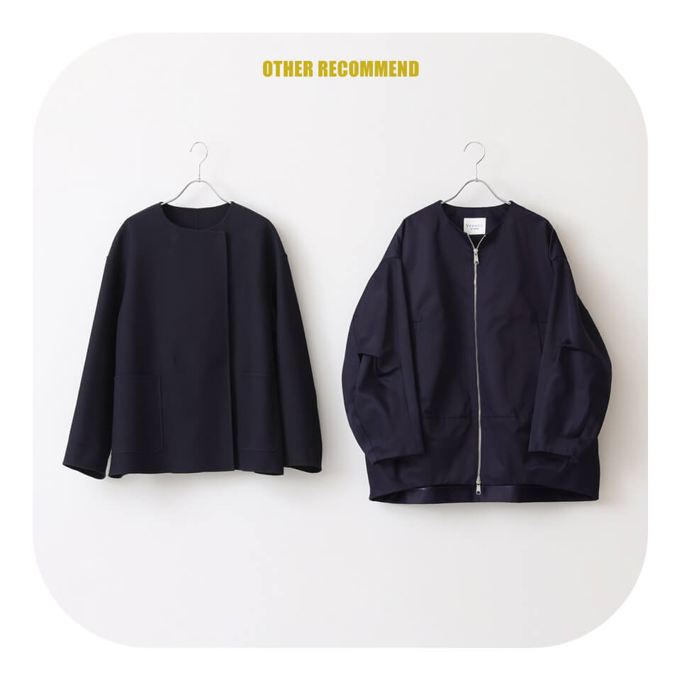 - ラフな印象のブルゾンはノーカラーに変えればキレイめもOK。着丈が短すぎず、身頃がゆったりとしたものを選ぶのがポイントです。軽快なリバー仕立てなら上品なムードもアップ。