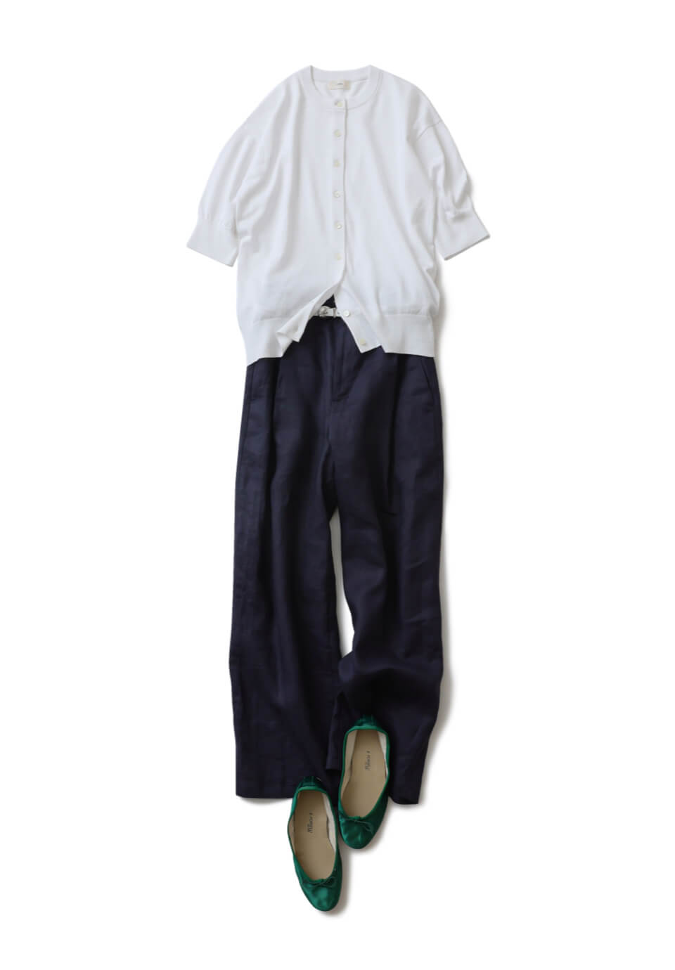 さらりとした肌触りが心地よい5分袖カーディガンのボタンを閉めてトップス風に。ピュアなホワイトにネイビーのリネンパンツをコーディネートして、リラックス感ときちんと感が大人バランスなパンツコーデをメイク。発色の良いグリーンのサテンバレエシューズで、足元に遊びを加えて。