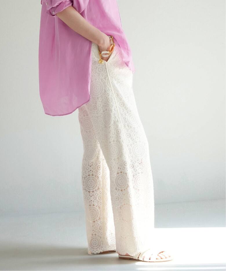 ホワイトで大人顔にシフトベイカーパンツは大人っぽい清潔感満載なホワイトのワイドシルエットをセレクト。レースパンツは、スラックスなら華やかさを残しつつ甘さを軽減。