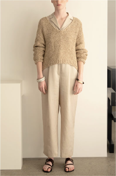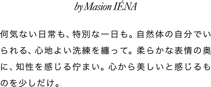 この春は、[sérénité]穏やかな静けさのなかにある美しさをさがして。透き通る春の光に寄り添うような、柔らかさを含んだ色と素材の質感。ニュアンスのある色をかさねて楽しむ、大人のカジュアルスタイル。IENAmaison Cotton Hand Vネックニット◆¥30,800(税込)IENAmaisonサテンオールインワン◆¥6,600(税込) 80%OFFIENA【DINOSAUR DESIGNS/ダイナソーデザイン 】SMALL IRREGULAR バングル¥13,200(税込)IENA【DINOSAUR DESIGNS/ダイナソーデザイン 】SLATE バングル¥13,200(税込)IENA【DINOSAUR DESIGNS/ダイナソーデザイン 】SMALL IRREGULAR バングル¥13,200(税込)IENA【Annika Inez / アニカ イネズ】ENDLESS CURVE EARRINGS GF ピアス¥27,500(税込)IENAmaison シルクコットン ストライプシャツ¥23,100(税込)IENAmaison*NALYA スリムテーパードパンツ¥24,200(税込)IENA【PHILIPPE AUDIBERT/フィリップ・オーディベール】JOY L BICOLOR リング¥9,900(税込)IENA【LAOCOONTE/ラオコンテ】別注フラットサンダル◆¥3,300(税込) 80%OFFIENAmaison リネンシルクイージージャケット◆¥41,800(税込)IENAmaison ラミーコットンルーズシャツ◆¥27,500(税込) IENA【MAISON BOINET /メゾンボワネ】ロープベルト¥11,000(税込)IENA【A.EMERY/エー エメリー】トングサンダル◆¥10,450(税込) 50%OFFIENA【HEREU/へリュー】cala◆¥49,500(税込)IENAmaison 42G SILK プルオーバー¥38,500(税込)IENAmaison カットワークレースドットスカート◆¥31,900(税込)IENA【MODERN WEAVING/モダン ウィーヴィング】TRAPEZOID HINGE ピアス¥29,700(税込)IENA【LAOCOONTE/ラオコンテ】別注フラットサンダル◆¥3,300(税込) 80%OFFMaison IENA collection 一覧IENA ショップトップ