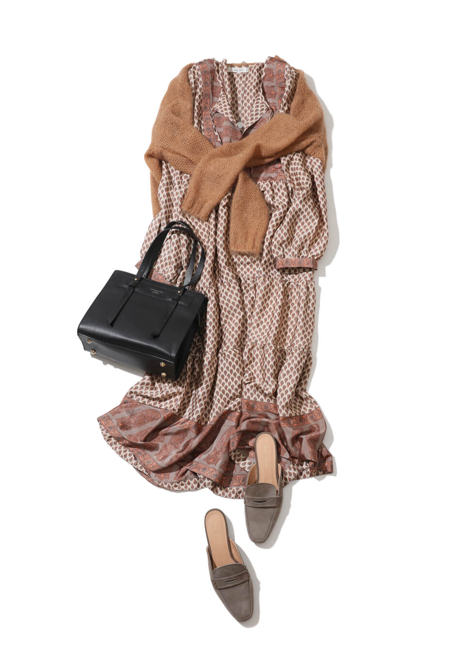 ヴィンテージライクな褪せた茶色のペイズリーワンピースは、1枚でサマになるオフの万能アイテム。少し朝晩は肌寒いから、シアーな透け感が女っぽいモヘアのローゲージニットを肩からゆるくかけて。甘さ一辺倒なワンピコーデには、ハンサムなローファー風スリッポンと黒バッグで辛めなスパイスを投入。 - SLOBE IENA【CHRISTIAN VILLA/クリスチャン ヴィラ】 スクエアバッグ◆¥24,200(税込)
