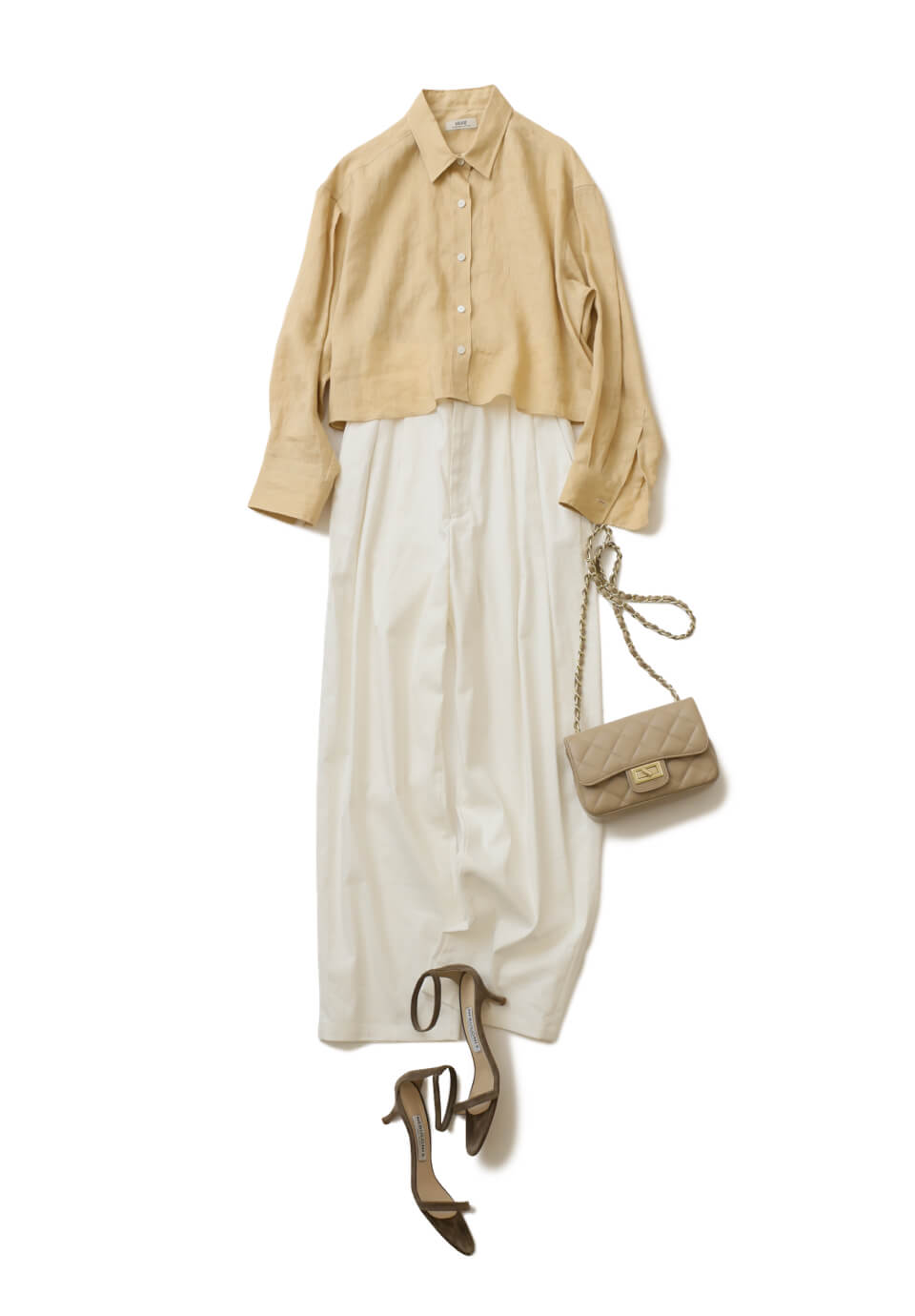 今年らしいスタイルバランスが簡単に作れるクロップドシャツは、大人コーデにも気軽に取り入れられて便利。この春注目されているイエローで投入すれば、さらにお洒落感度がアップ。ボトムスも旬なコクーンを描くワイドパンツをつないだら、クラシカルなチェーンバッグとサンダルで大人顔にまとめて。
