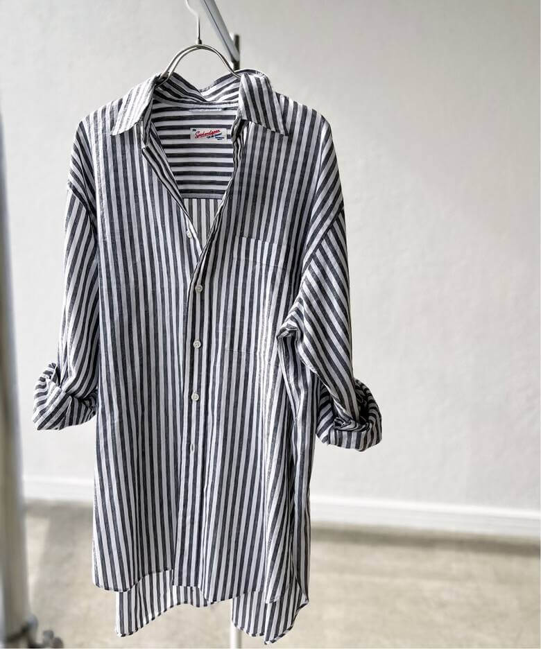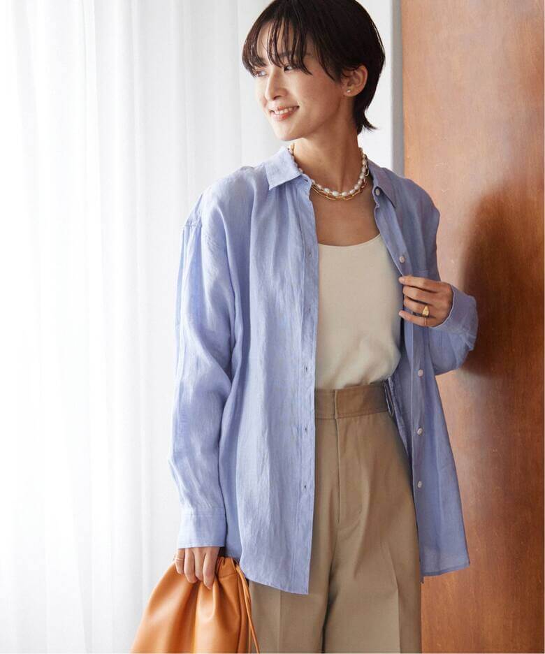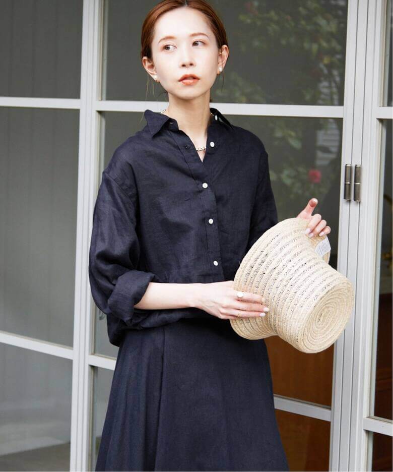 端正なリネンシャツを1枚ストックしてフィットは大きすぎずタイトすぎない、絶妙なゆるさがこなれ感を演出。ネイビーや黒ストライプといったシックな色味なら、リネンでもほっこりせずスタイリッシュな印象に。