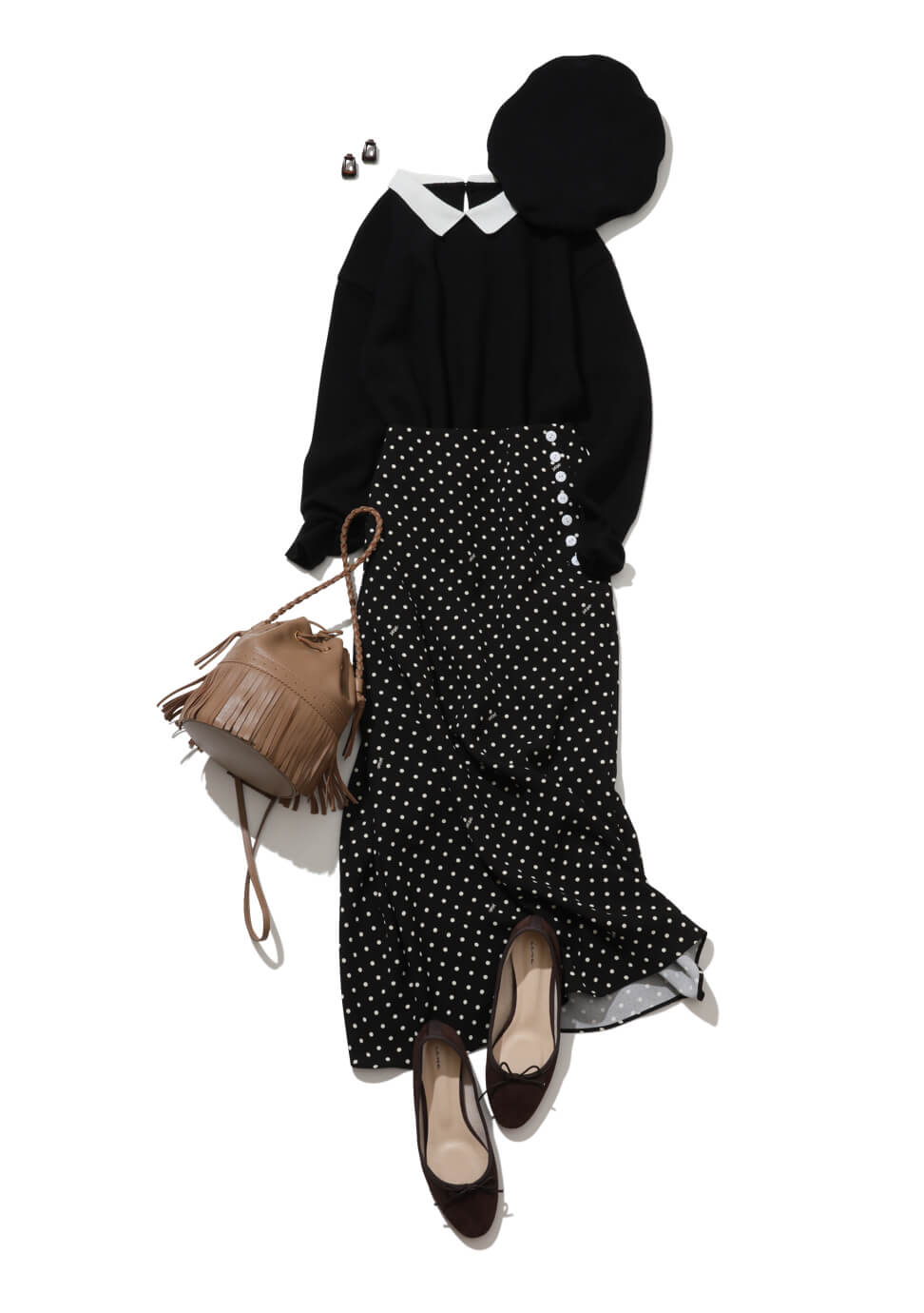 ドットのマキシスカートをはためかせた、可愛げたっぷりのパリジェンヌ。高めのウエスト位置がスタイルアップも狙えそう。クラシカルで甘めのデザインなので、全体をモノトーンでまとめてモードに仕上げるのが大人っぽさのポイントに。大振りのイヤリングやフリンジバッグといった動きのある小物で余韻を残して。 - IENAsese襟付きミラノリブプルオーバー◆¥17,600(税込)