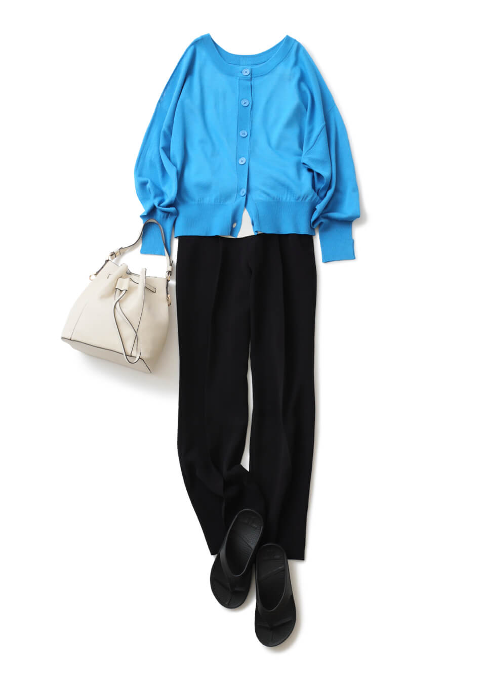 パキッとした鮮やかなブルーがトレンドムードを盛り上げるカーディガン。フロントボタンを閉めてトップス風に着こなして。センタープレスが入ったキレイめの黒スラックスをつなぐことでメリハリが生まれ、洗練感のあるワンツーコーデをメイク。バッグはクリーンなホワイトで爽やかに。
