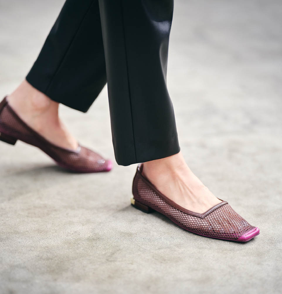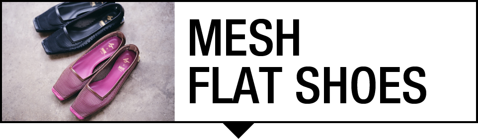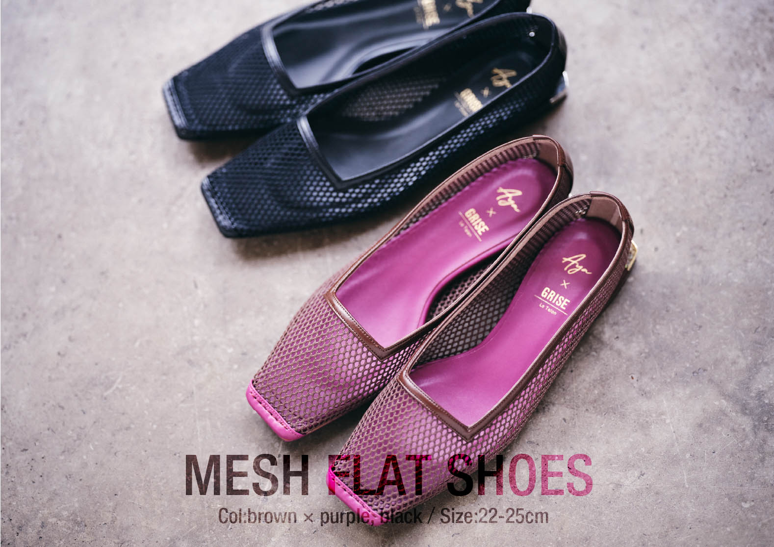 - Ayaさんがこの春気になる「透け感」を実現するメッシュ素材のフラットシューズ。ヌーディーさをポイントにしながら、形はあえてフラットシューズでカジュアルダウン。デザインの随所にセンスとこだわりが詰め込まれた一足に。ネイルとの組み合わせも楽しんで。