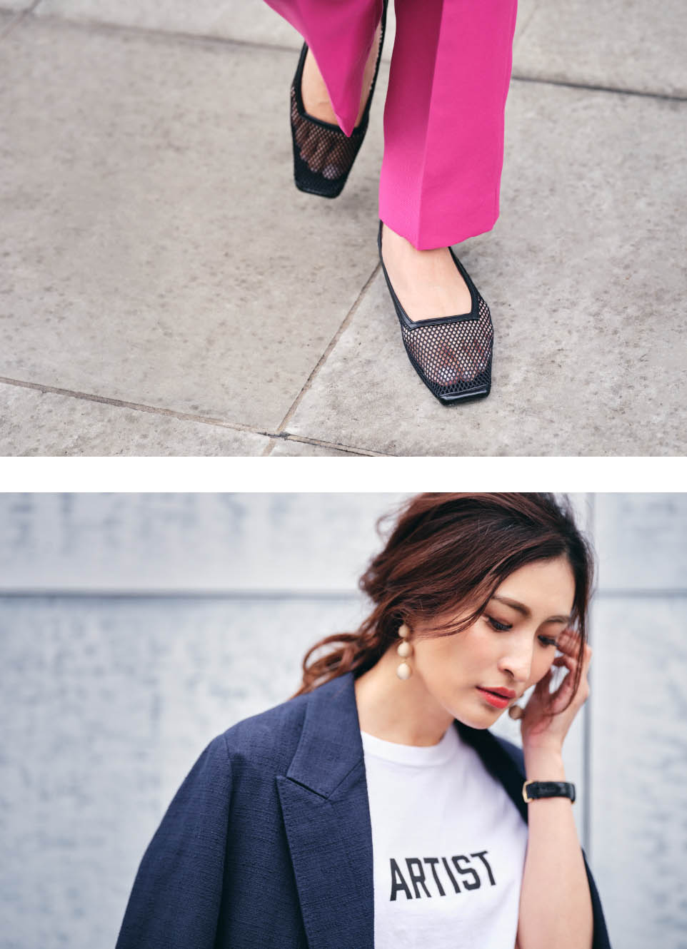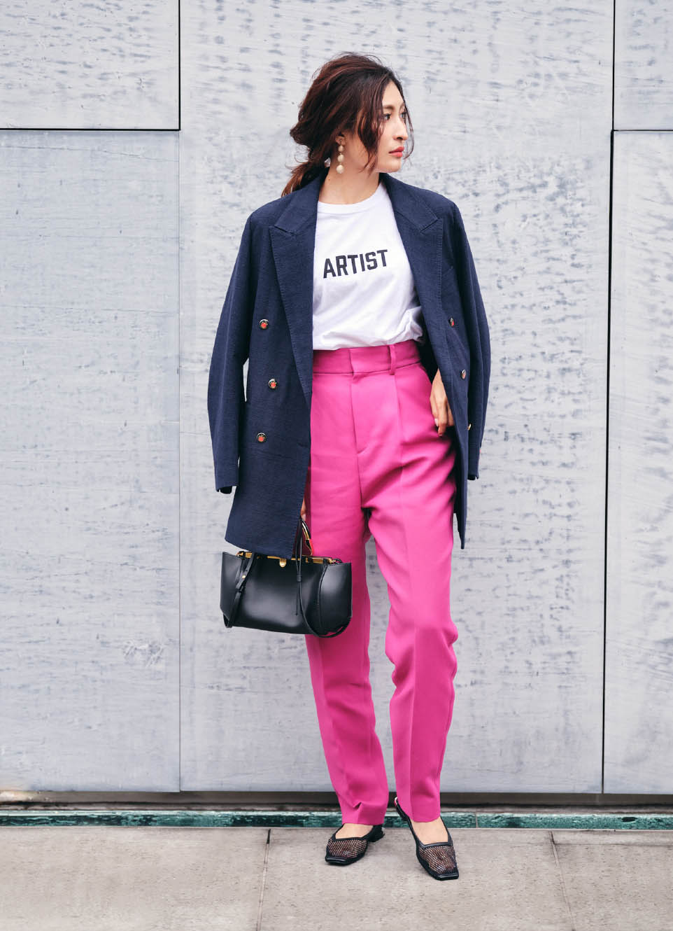 - 「トラッドなダブルのジャケットにはロゴTでカジュアルに、ヴィヴィッドなカラーパンツでトレンド感を。フューシャピンクのインパクトを引き締めるのはやっぱり黒。透け感があるから足元に黒を持ってきても重たくならないんです。シャープなスクエアトゥの印象が気に入っていたので、履き口のカッティングも合わせてスクエアにしてみました。」