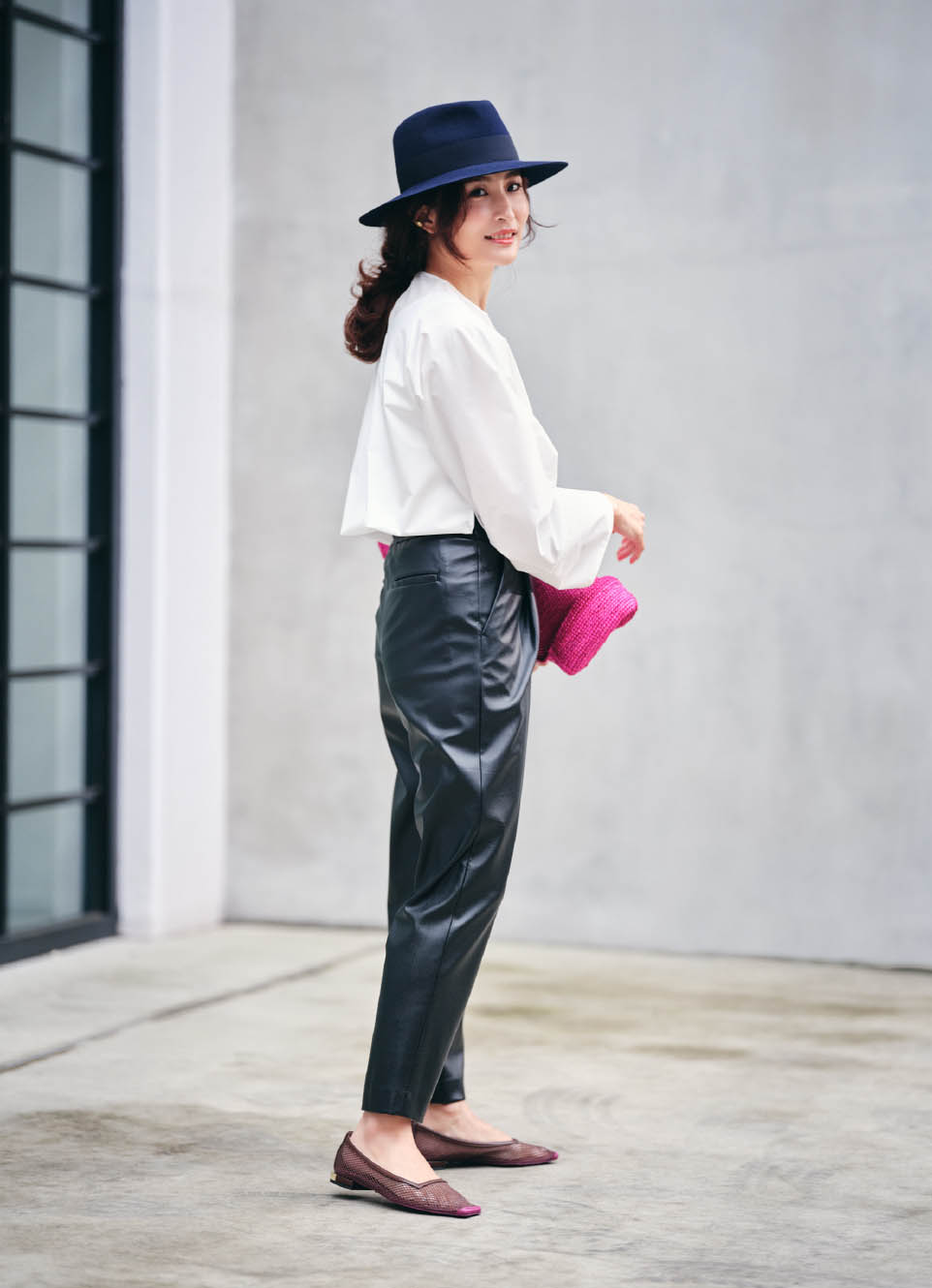 - 「モノトーンのコーデにあえてブラウンのシューズでハズし、足元に変化と抜け感を出しました。そして、私の中でいま気になる色がパープル。せっかく透け感のあるシューズなので、インソールは思い切ってつま先のパイピングと同じパープルに。履いた時に指先から少しだけ透けて見えるのがポイントです。」