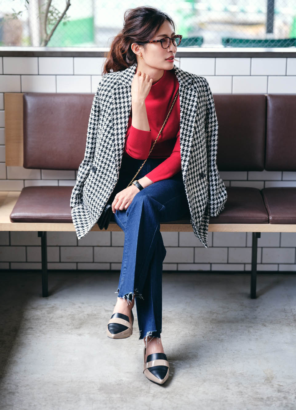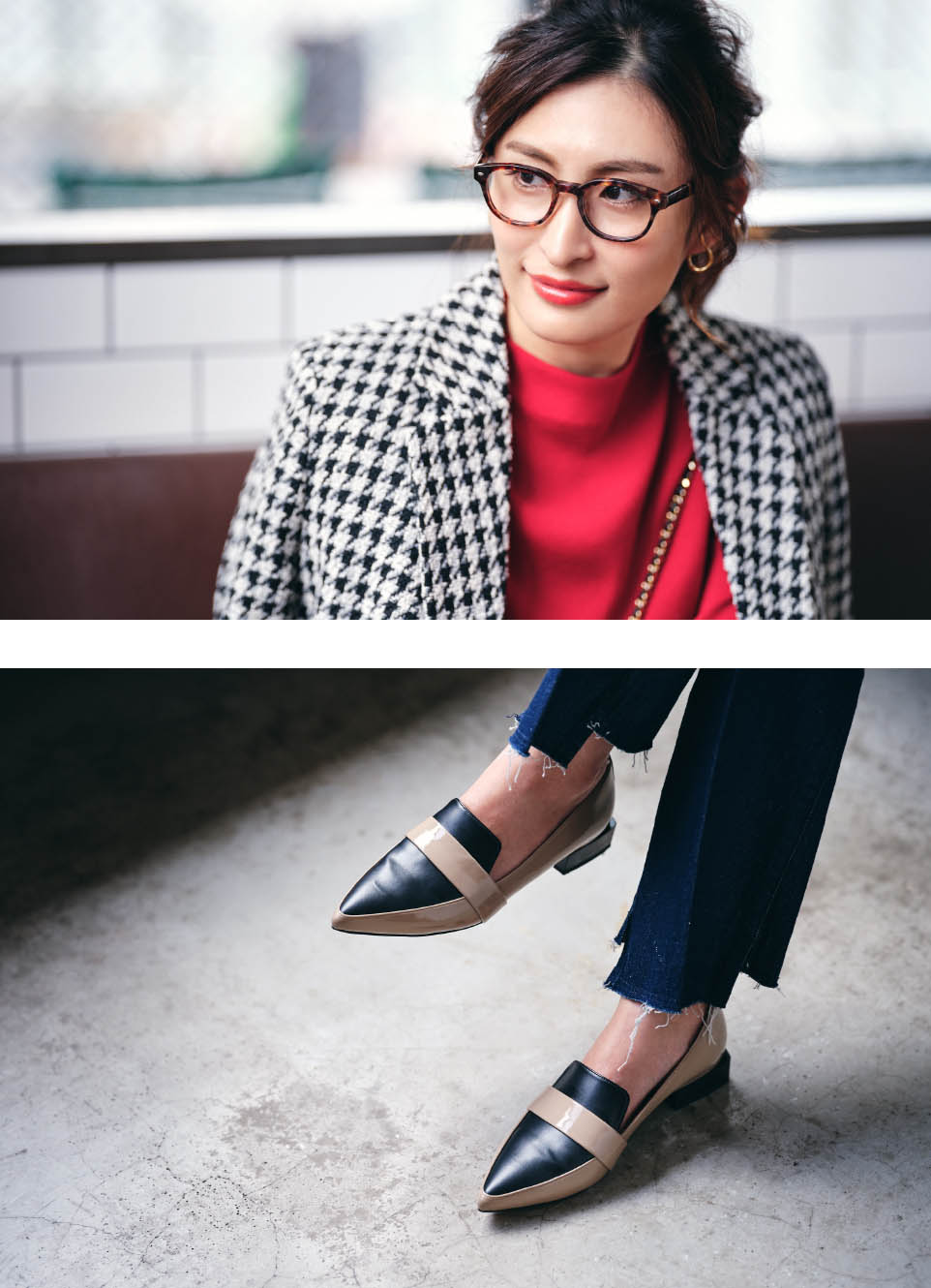 - 「靴のベージュと相性のいい赤を差し色に、春らしくクリアなブルーのデニムで合わせました。クラシックなムードのスタイリングにも、辛口のローファーが今っぽいバランスに仕上げてくれます。ローファーにはかかとの部分に縦ラインで配色を持ってきて、街中でハッと目に留まるような後ろ姿のワンポイントを作りました。」