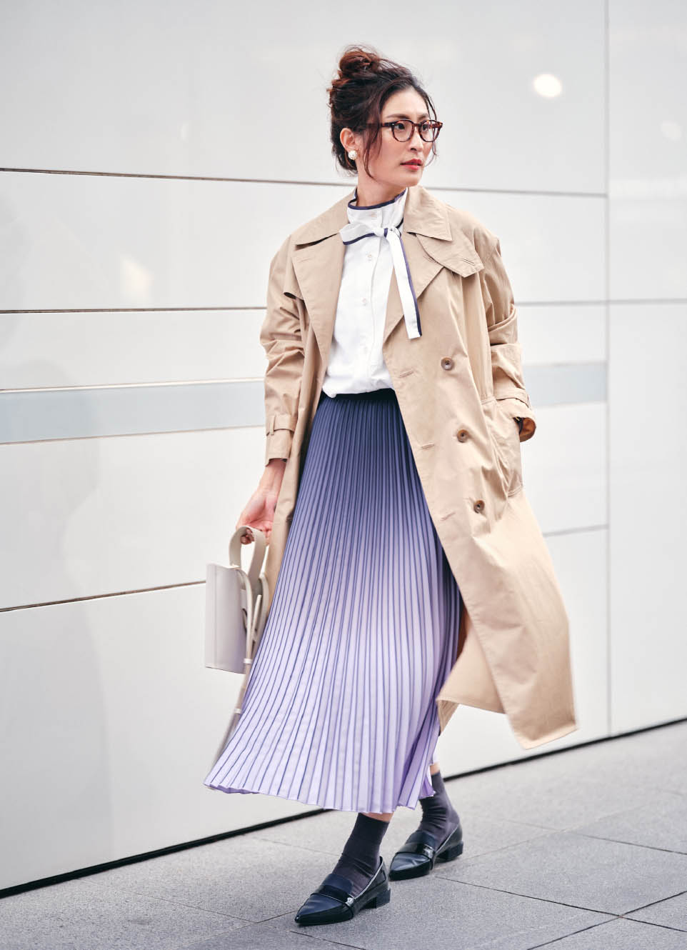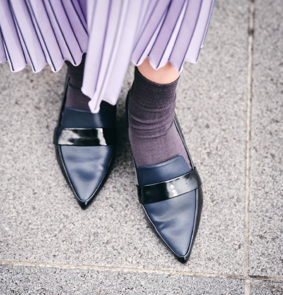 - 「ローファーとトレンチコートは定番の組み合わせですよね。ポインテッドトゥだからこそ、ローファーでもマニッシュになり過ぎず、プリーツスカートのような女性らしいアイテムとも合わせやすいんです。今の季節はソックス合わせのアレンジもしたかったので、窮屈にならないように靴のフィット感は何度も微調整させていただきました。」