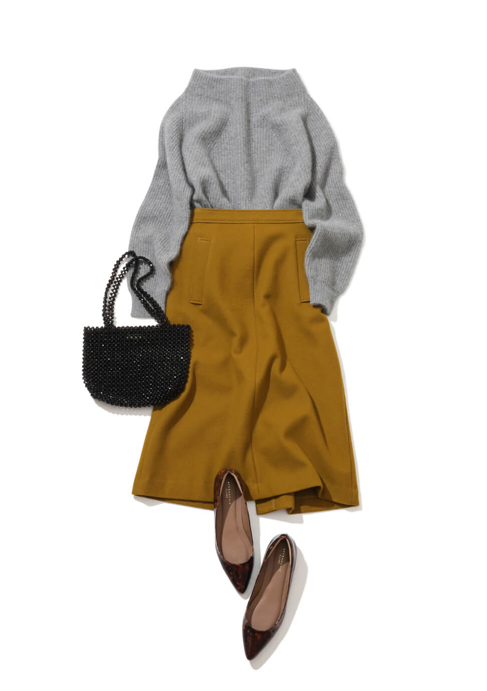 季節感を簡単に取り入れられて優しげなニュアンスも醸し出す、バルーン袖のふわふわファーニットが主役。マスタードのタイトスカートにインして、品の良いグッドガールな秋コーデに。ただ甘いだけじゃつまらないから、小物でスパイスを添えて。異素材が目を引くビーズバッグと、シャープなポインテッドトゥのレオパードシューズで辛口に。 - SLOBE IENAラクーンカシミヤ混タートルプルオーバー◆¥11,000(税込)