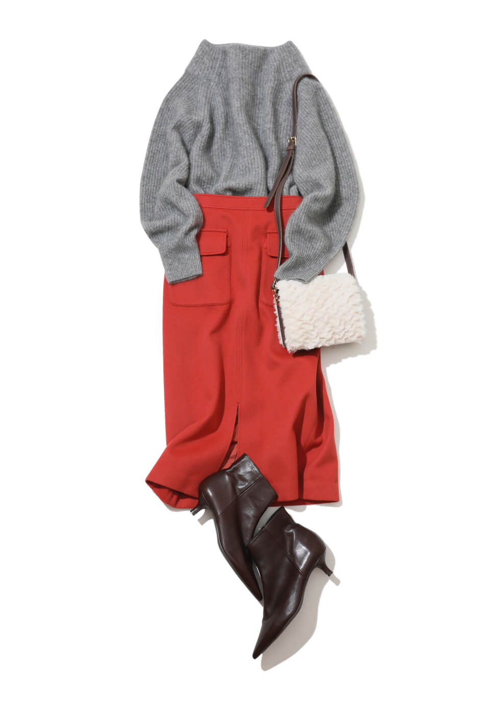 大きめのダブルポケットがアクセントに効いたオレンジスカートが、お洒落度をワンランク格上げ。引き立てるために、合わせるニットはシンプルにまとめて。ブラウンのアンクルブーツでほんの少しだけ肌を見せるのもポイント。シーズンムードを高めるモコモコのファーバッグは、可愛げのあるホワイトのショルダーをセレクト。 - Spick and SpanFURMIX アゼボトルネック◆¥16,500(税込)