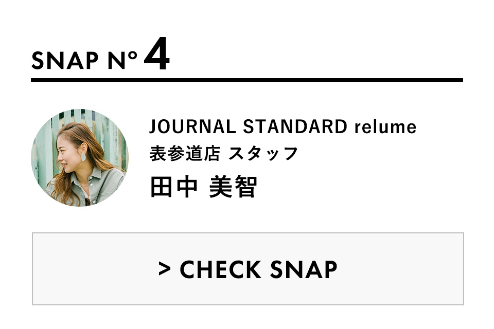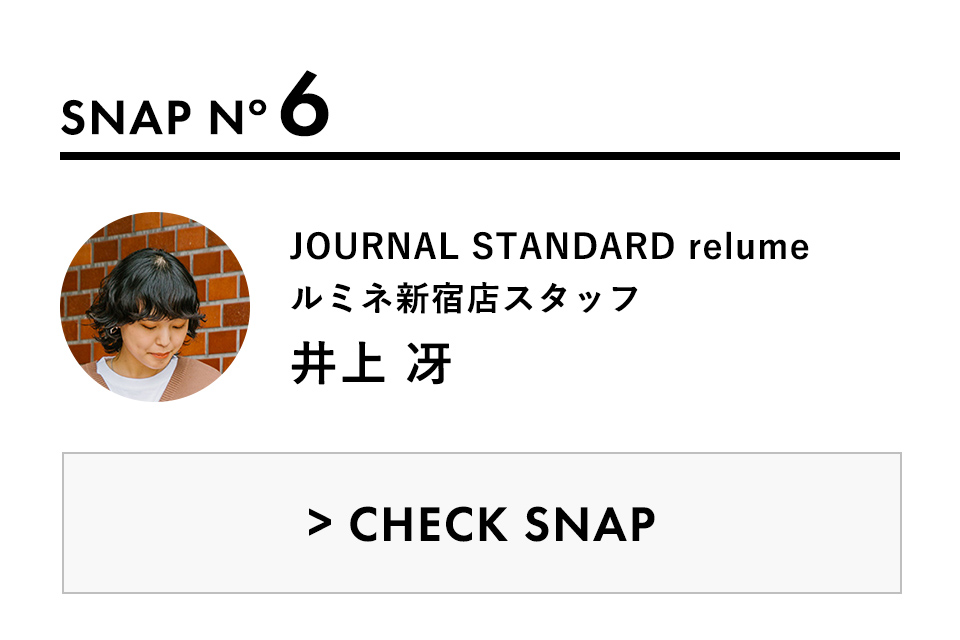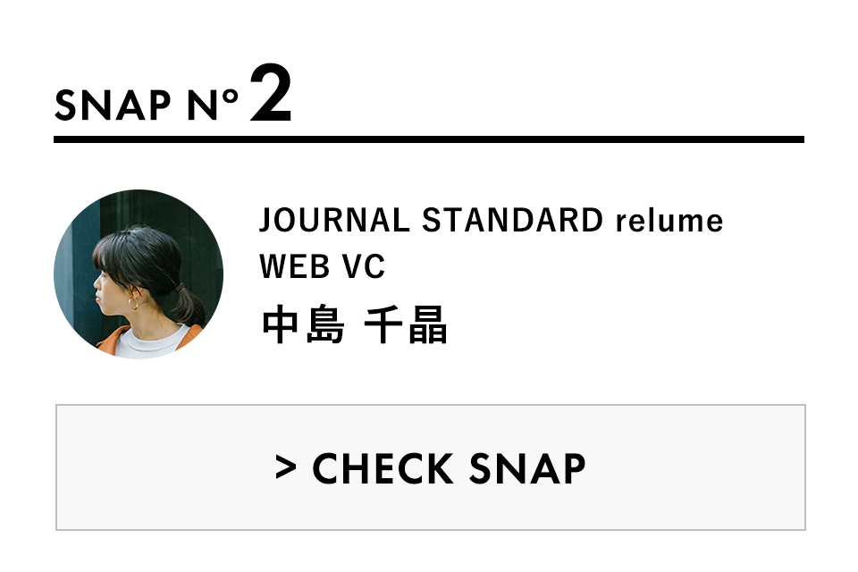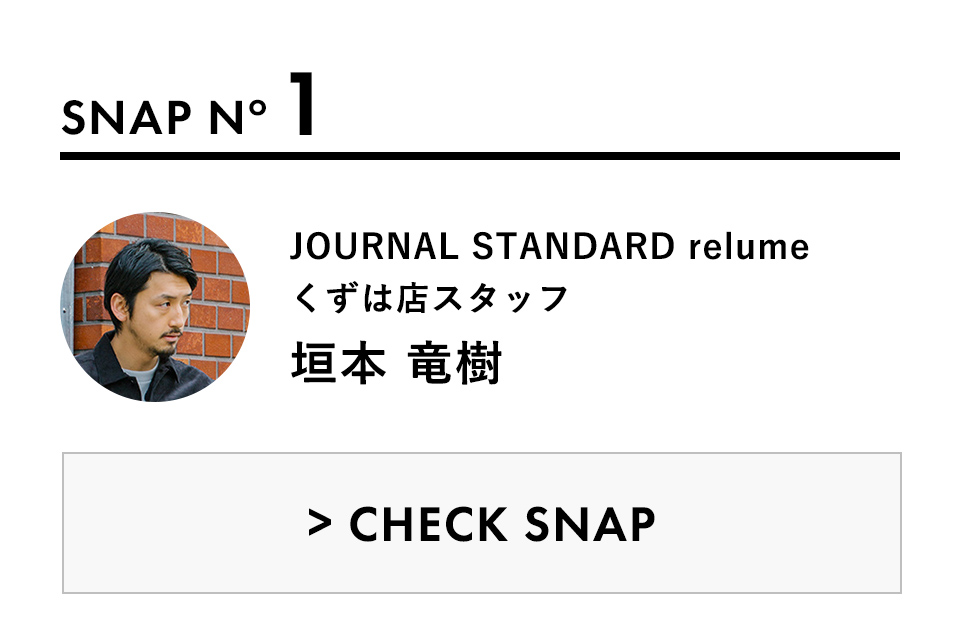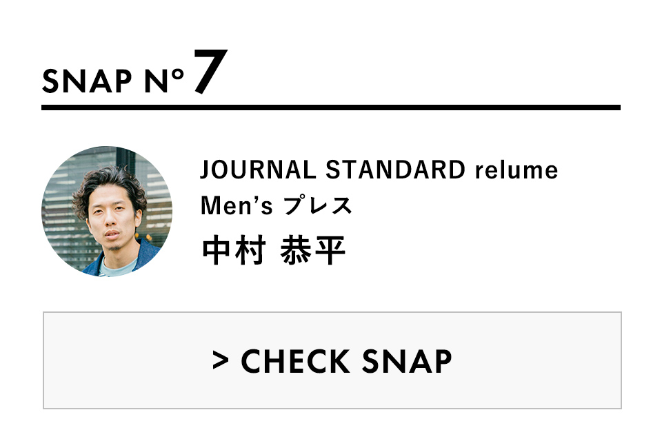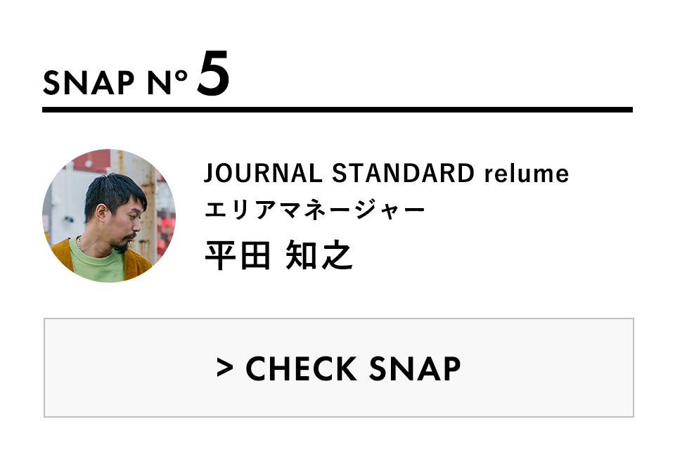 SNAP形式で、JOURNAL STANDARD relumeのスタッフの着こなしをお送りします。