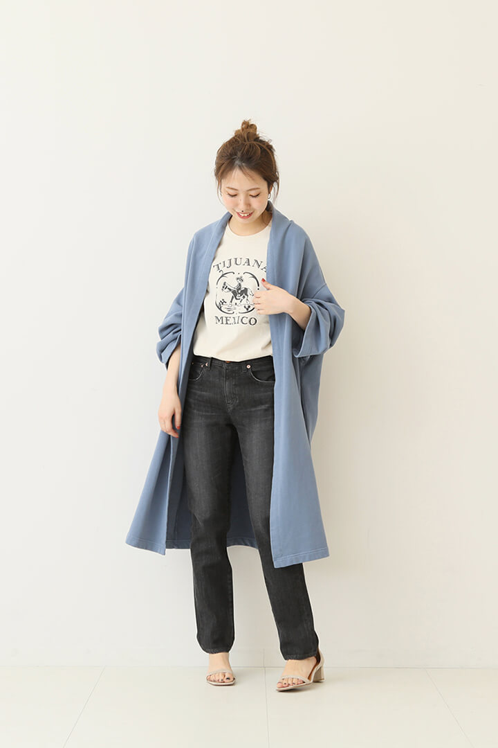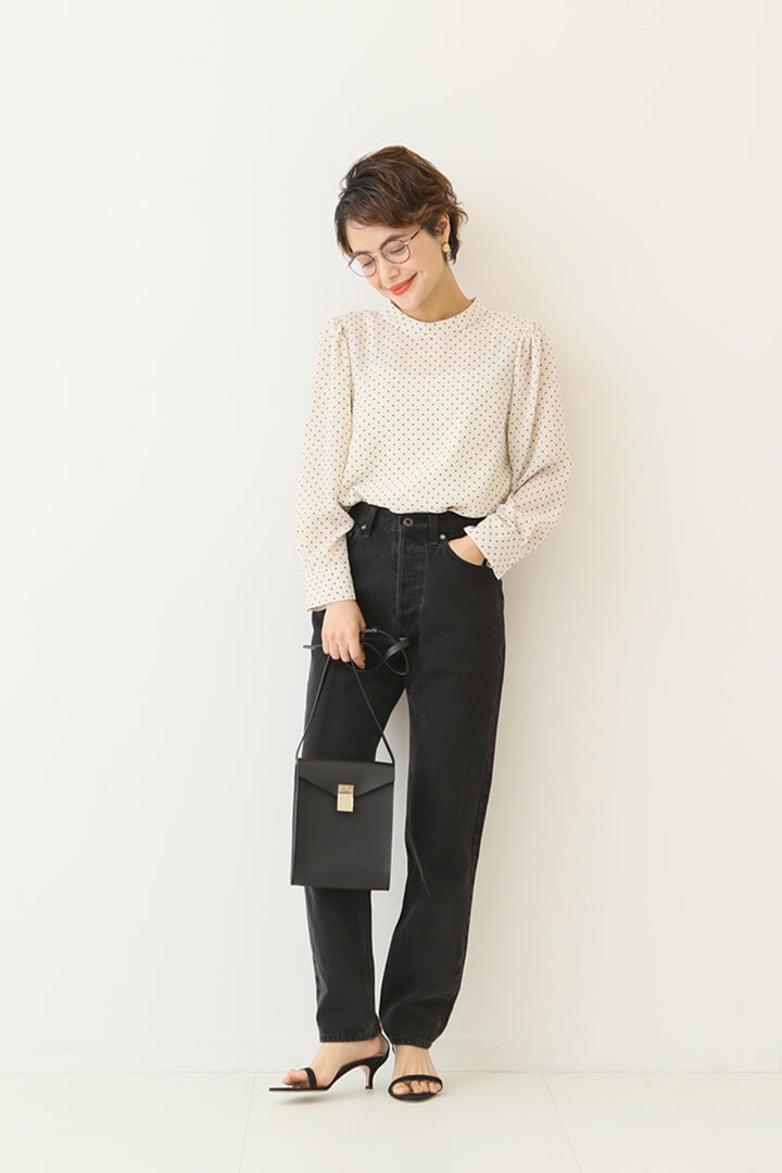 甘くなりすぎないよう、ブラックのデニムと小物で大人っぽく着こなしたいです。