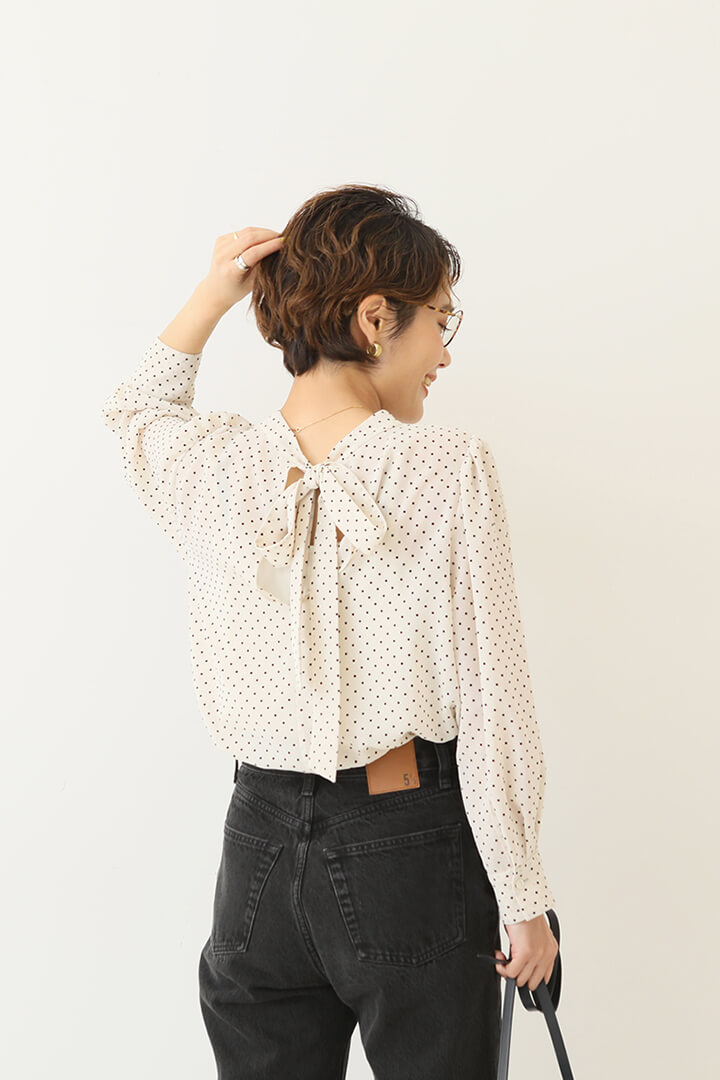 だから軽やかな梨地にフロッキープリントのドットをのせたヴィンテージっぽいこのブラウスには一目惚れ。
