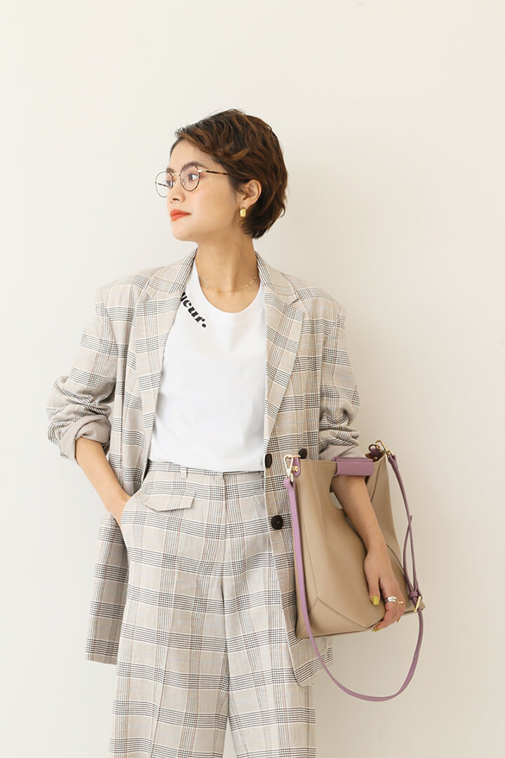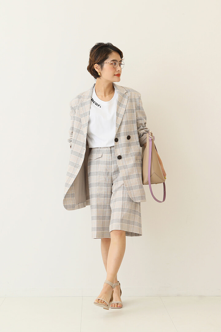 このセットアップは膝丈のボトムと、ピンクやブルーが入ったチェックの配色も遊び心があってお気に入り。