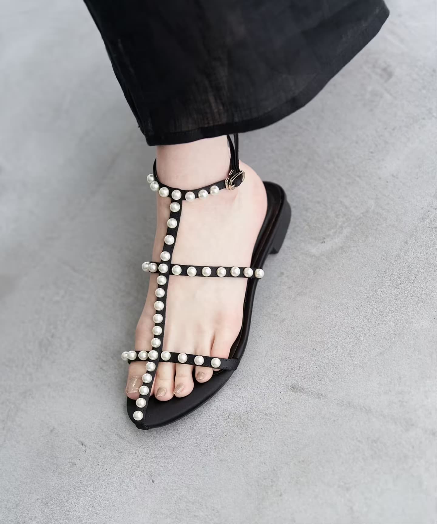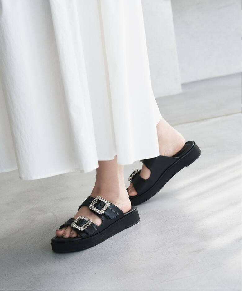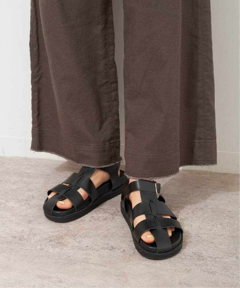 女っぽコーデにエッジをプラスカラーに迷ったらブラックを選べばまず間違いなし。LE TALONのビジューバックルサンダルは、フェミニンだけどエッジも光る厚底のブラック。シンプルなカジュアルにはグルカサンダルが引き締め役に。