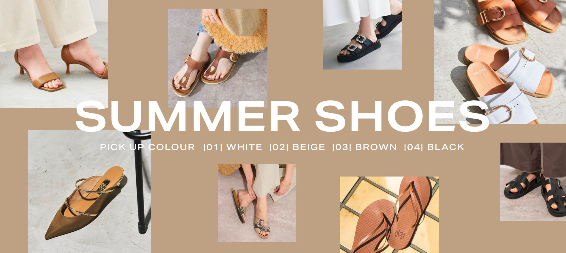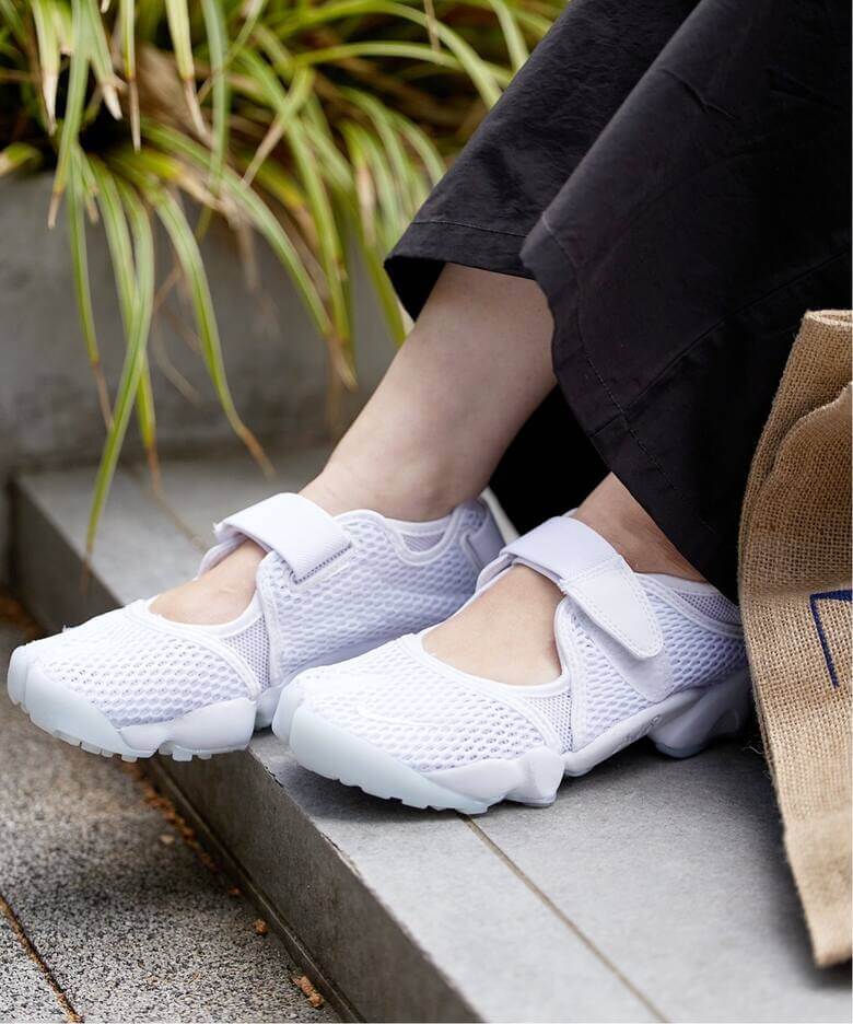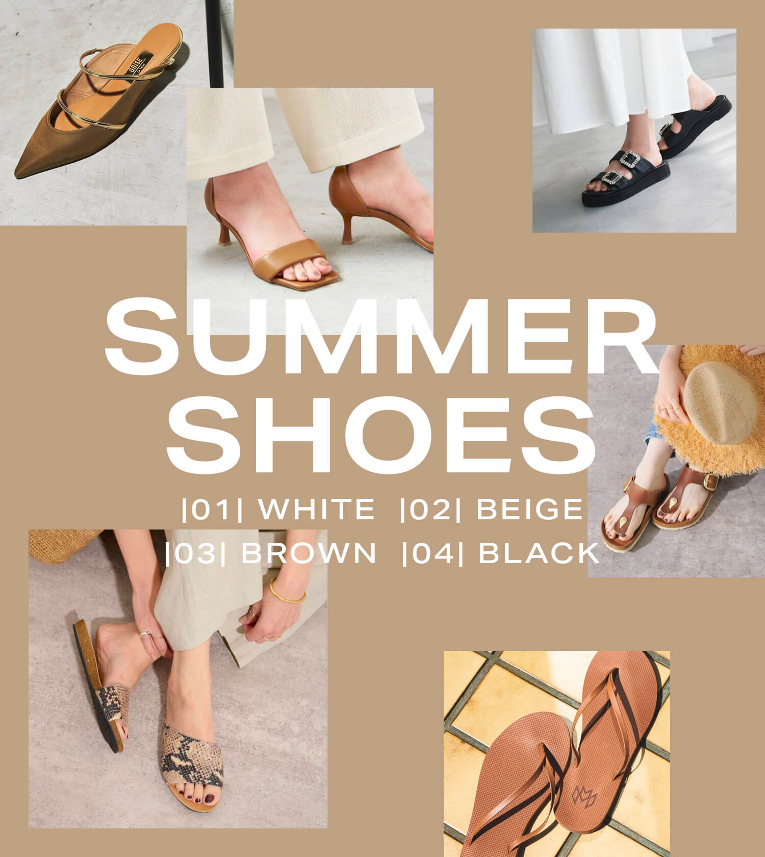 クリーンな足元で全体を軽やかに夏らしい爽やかさはピカイチなカラー。太バックルのモダンなフラットからカジュアルなNIKEまで、白を差し込むことでコーデ全体が軽やかにブラッシュアップ。グルカサンダルは抜け感を出すのに◎。