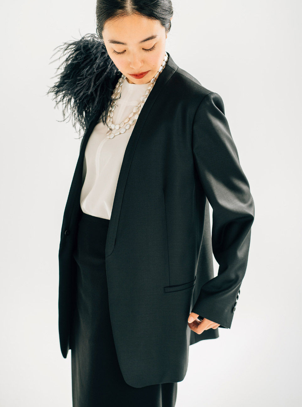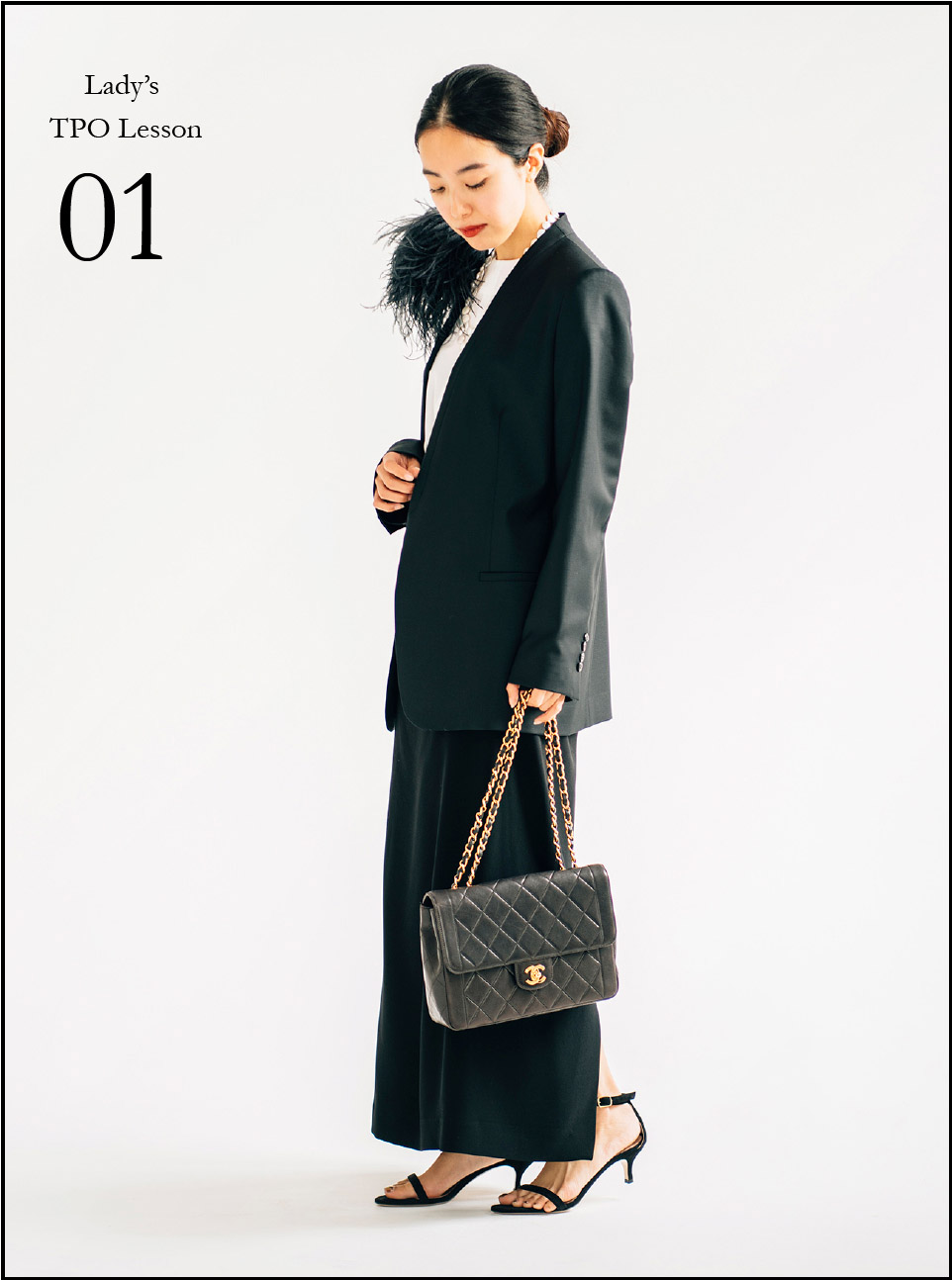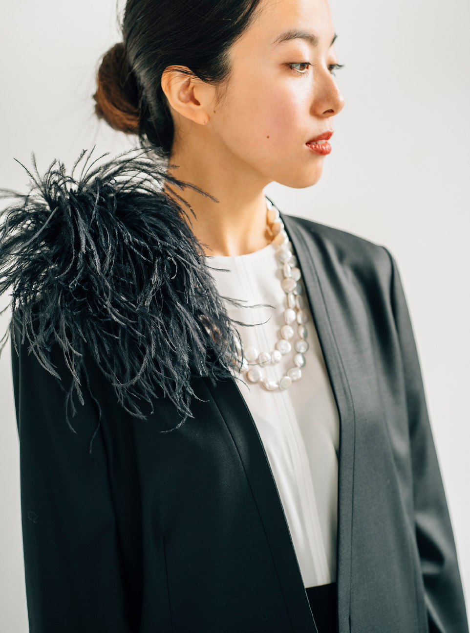 - ブラックフォーマルを基軸にしながら、大振りのフェザーコサージュと2連ネックレスがアクセントに。タイトスカートで縦長の美シルエットを強調して。