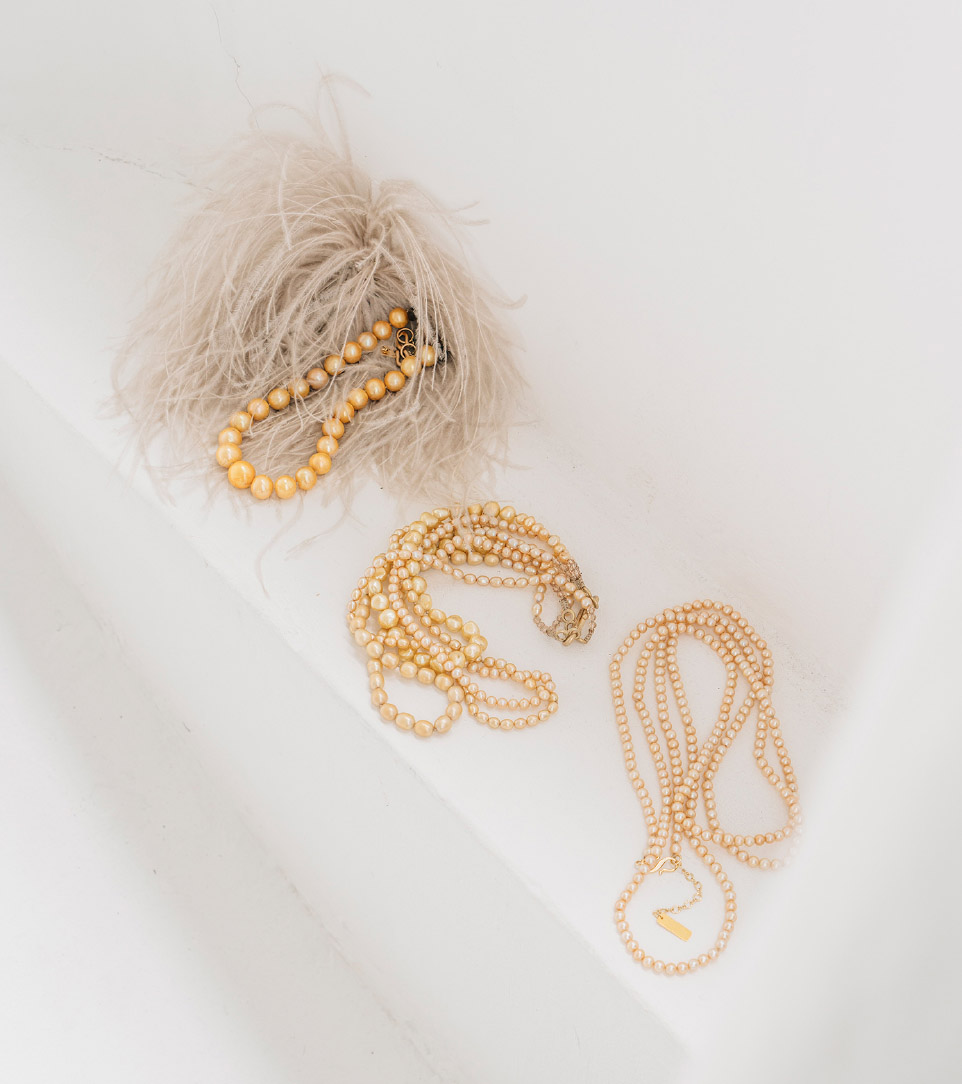 - コサージュは贅沢なオーストリッチ。上品な華やかさを演出します。シンプルなニットに映える多連ネックレスは大人の女性なら1つは持っていたいフォーマルアイテム。