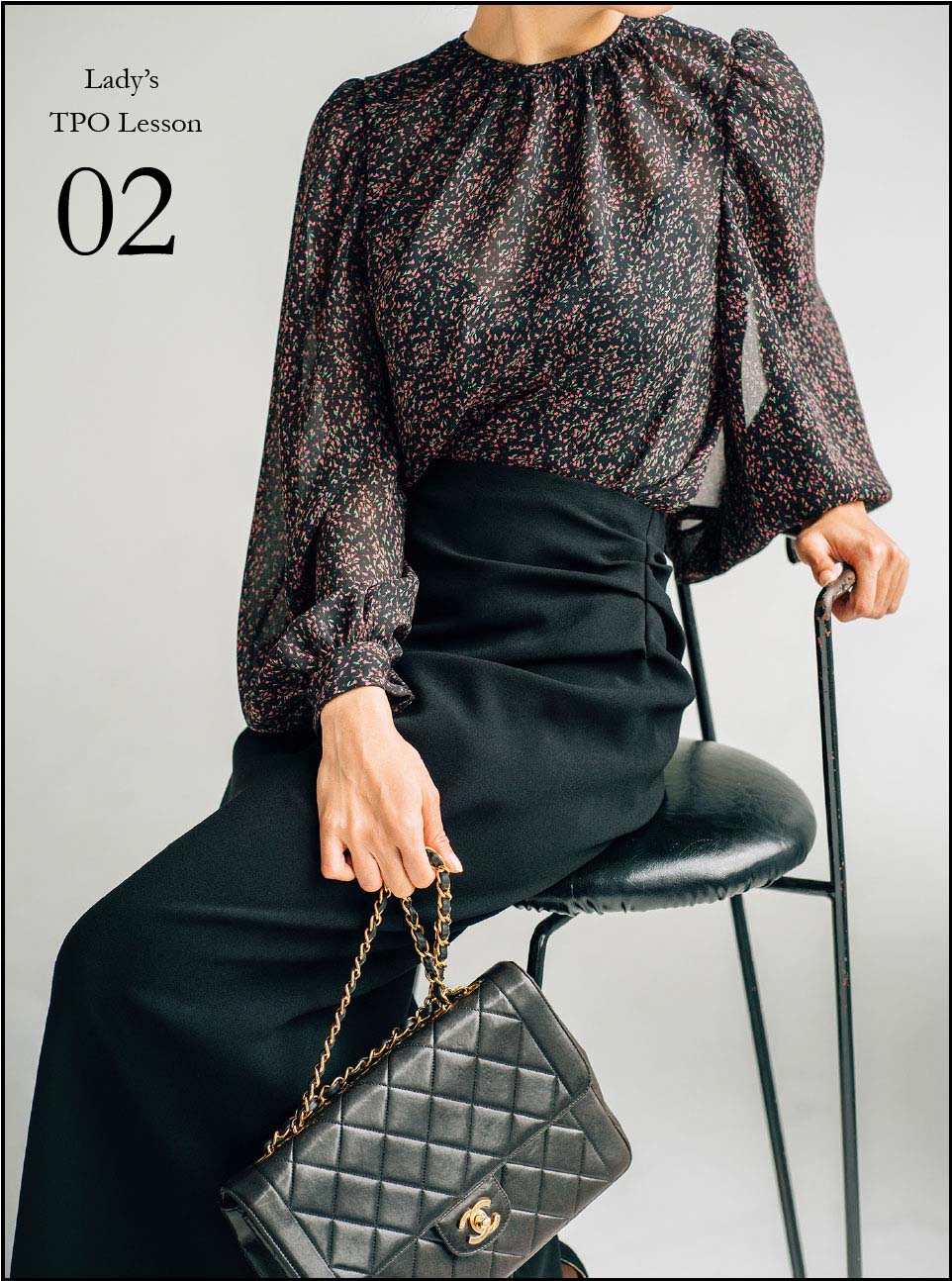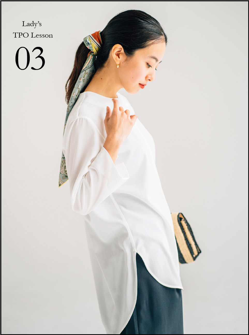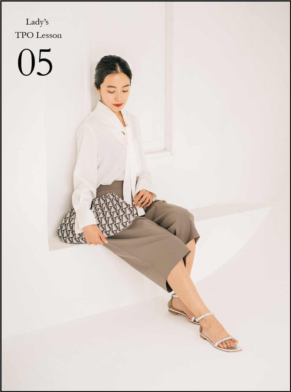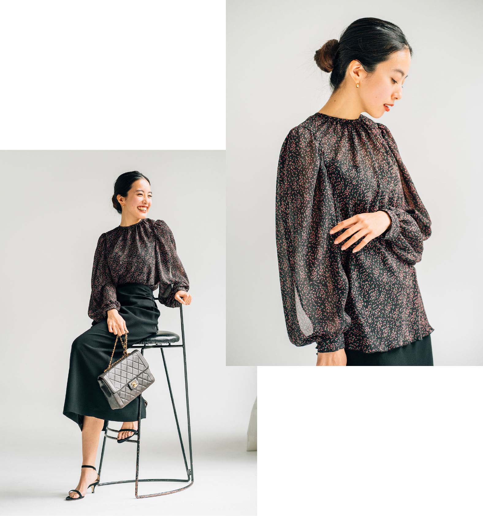 - 今っぽく垢抜けたきれいめブラウスなら、どんなフォーマルシーンにも対応できそう。耳元にはきらりと光るダイヤのピアスで、クラシカルな華やぎを。