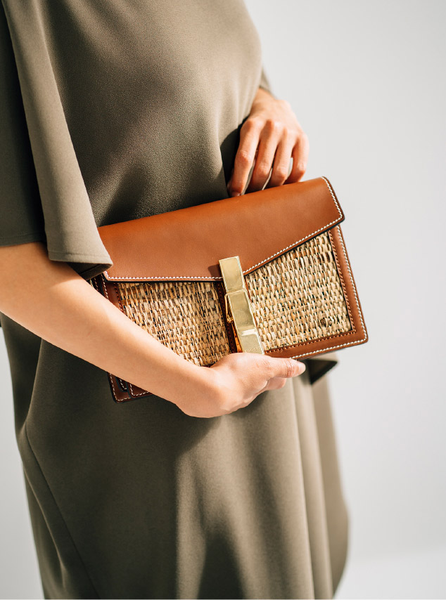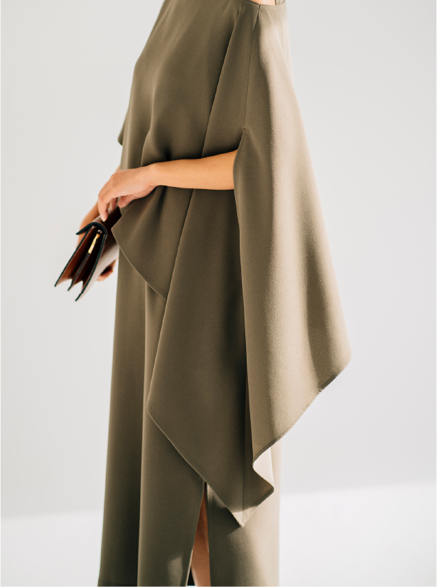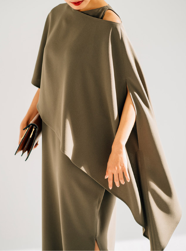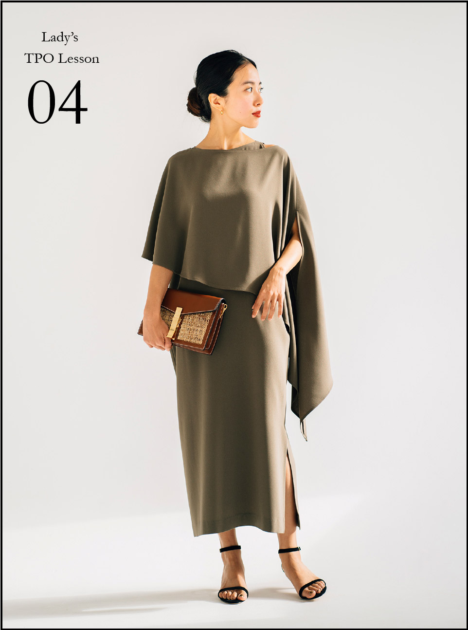 - 上品なドレープラインのアシンメトリーケープがポイント。ケープを外してもエレガントな雰囲気をキープ。クラッチバッグはあえてナチュラル素材とのコンビで抜け感をプラス。