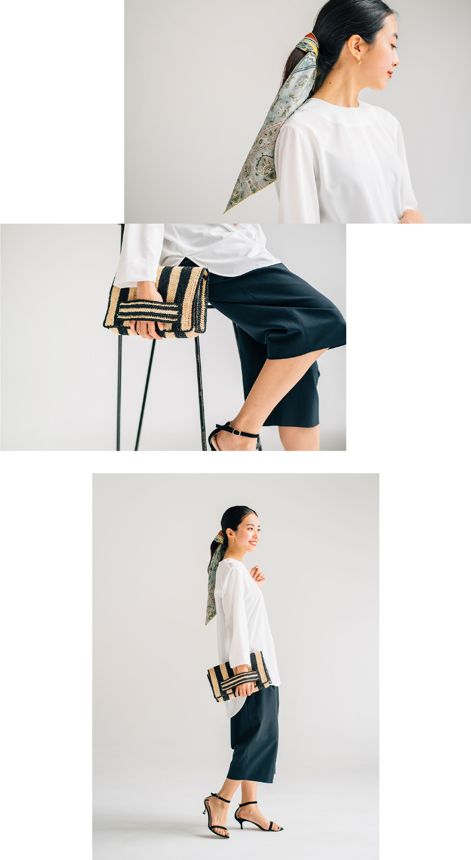 - ミニマルな白ブラウスに、ネクストトレンド筆頭株のキュロットパンツ。ワンポイントに効かせたスカーフが、華やかさを盛り上げます。