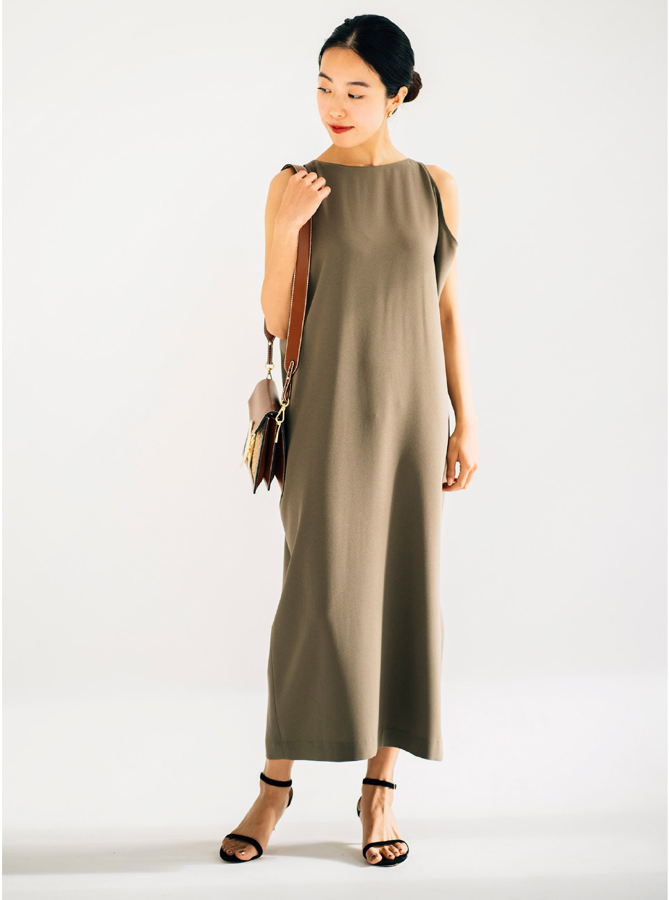 - 1枚で“いい女”ムードが満点の、ケープ付きのジョーゼットワンピース。さらりと着こなして、ブライダルやパーティに繰り出して。