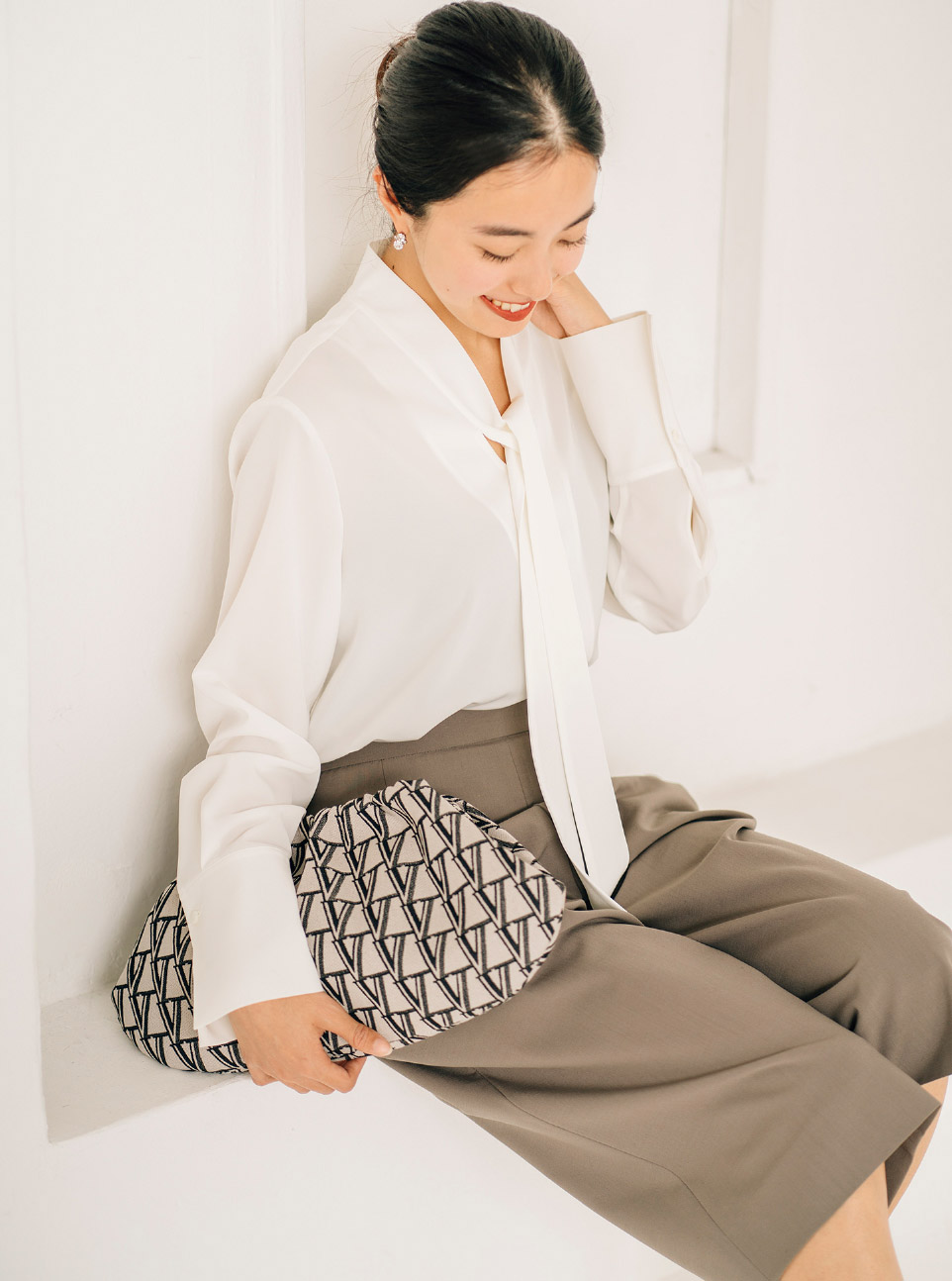- 知的さと華やかさを盛り込んだボウタイシャツ。トレンドのキュロットパンツでほどよく外しつつ、ワンストラップサンダルでセンシュアルにまとめて。