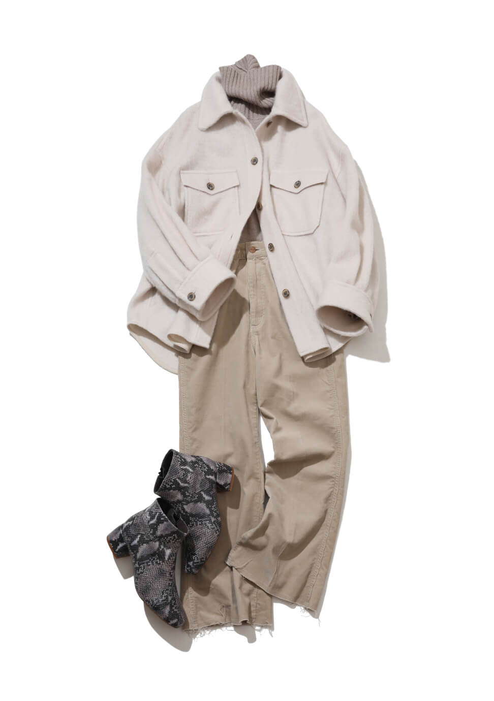 この秋冬のトレンド最有力候補アウターといえば、CPOジャケット。彗星のごとく現れた旬顔ジャケットを主役に、ラフなボトムスコーデをメイク。メンズライクなユニフォーム感が強いアイテムだからこそ、女性らしい優しさを内包したオフホワイトを選んで。インナーのタートルネックニットやフレアパンツはカフェラテトーンに統一を。 - JOURNAL STANDARDウールシャギーシャツブルゾン◆¥27,500(税込)