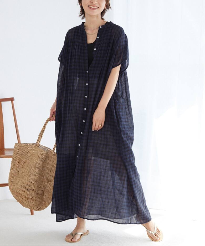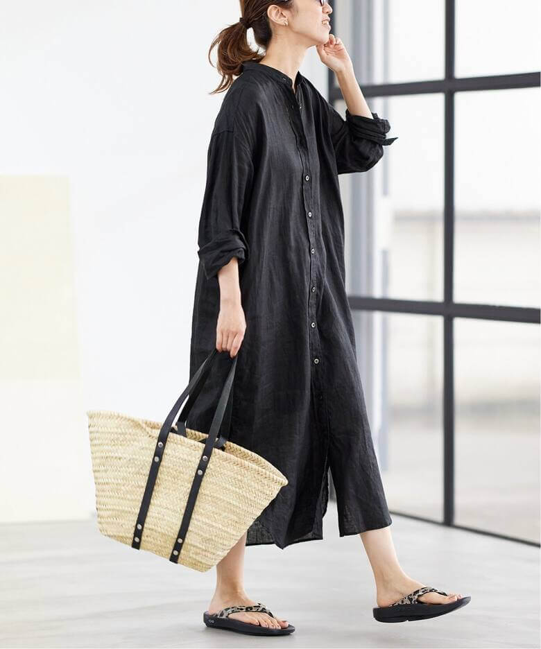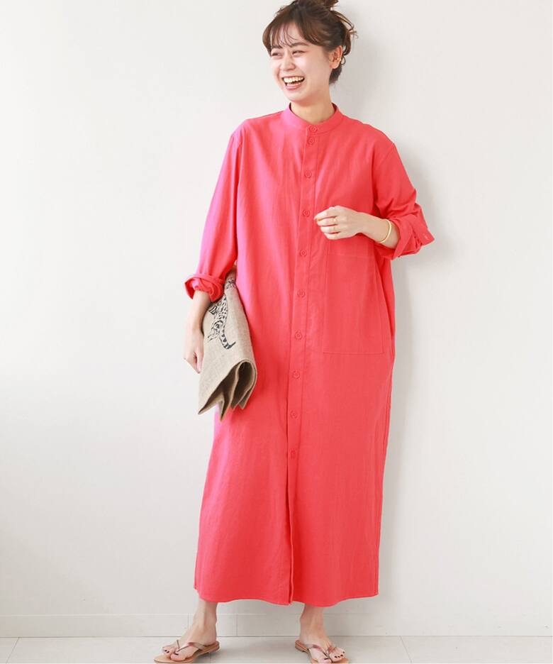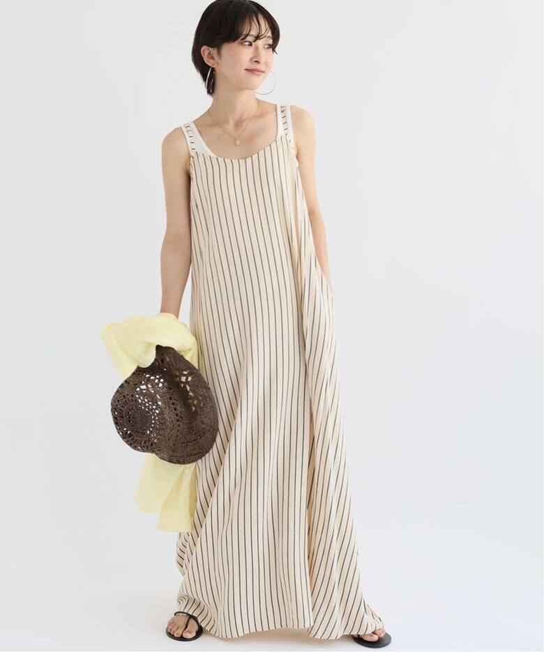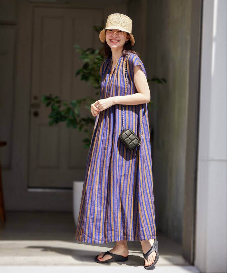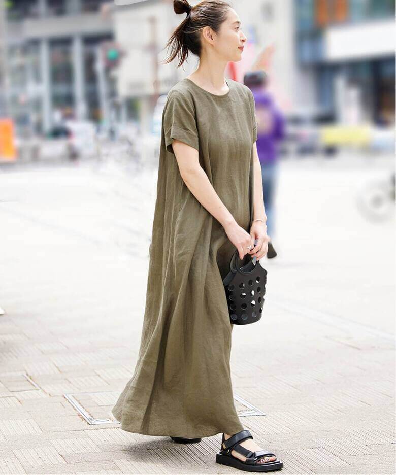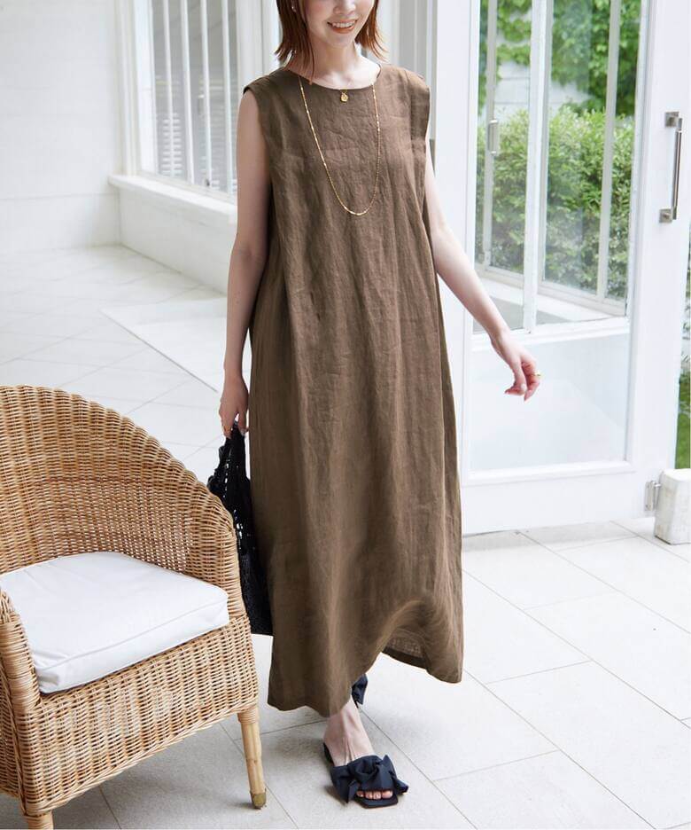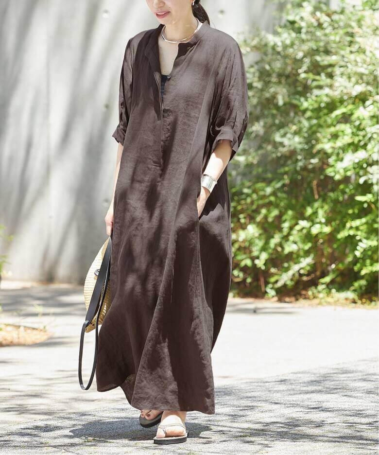 タウンユースできる大人デザイン涼しくまとえるリネンのマキシワンピースは、ブラウンやカーキといった落ち着いたカラーを選んでほっこりせずシティライクに着こなすのがポイント。ストライプはブルーやグリーンといった鮮やかなトーンが◎。