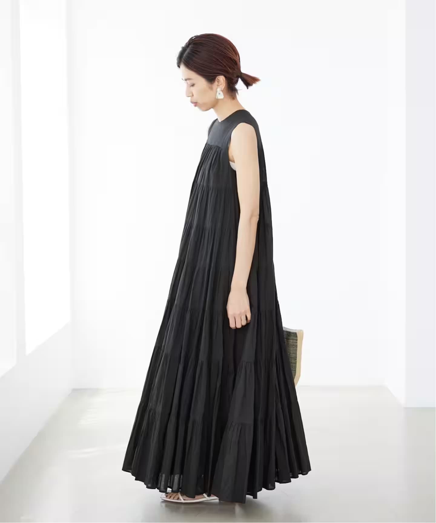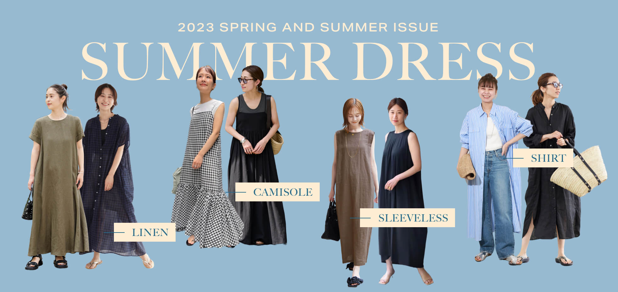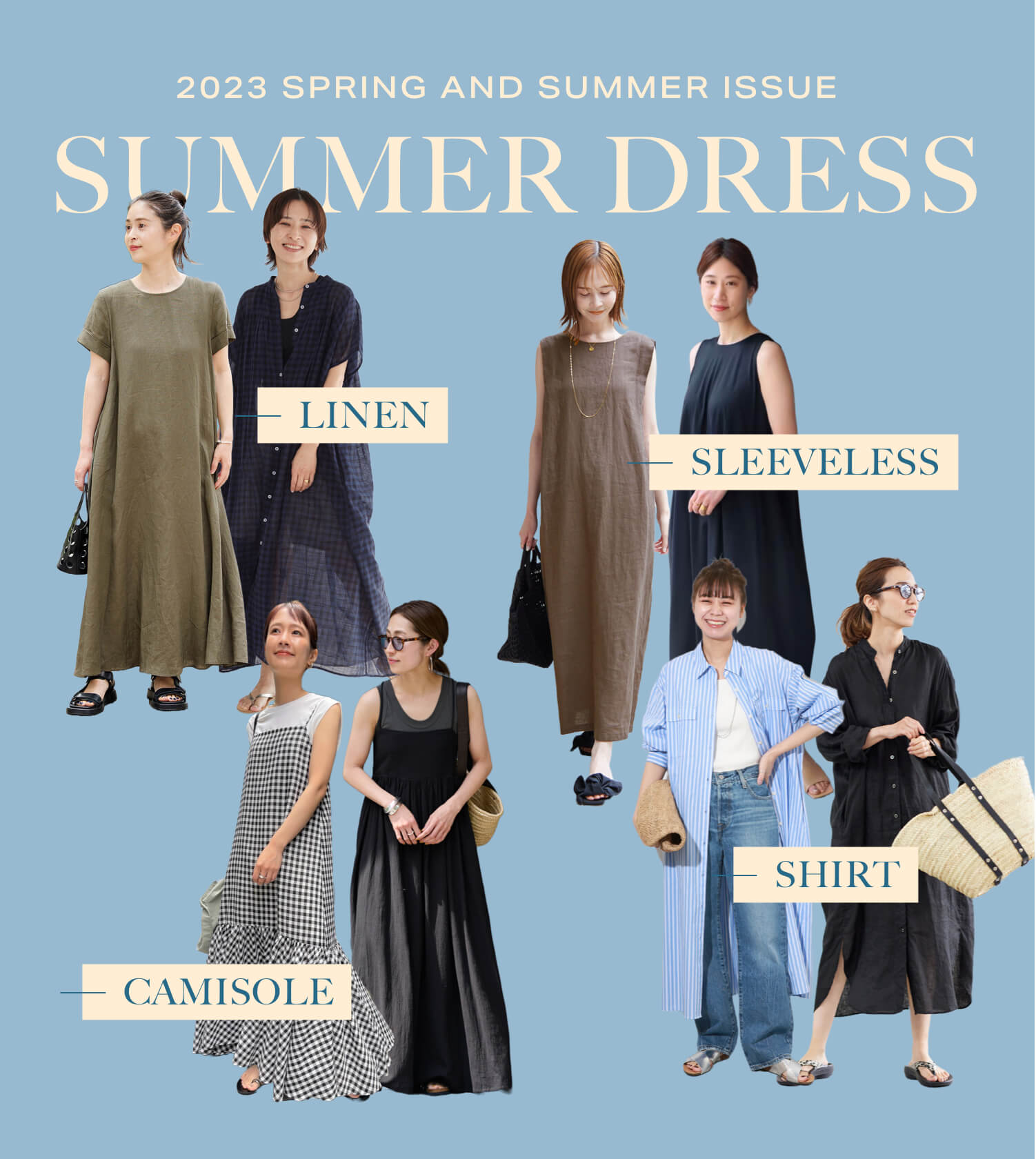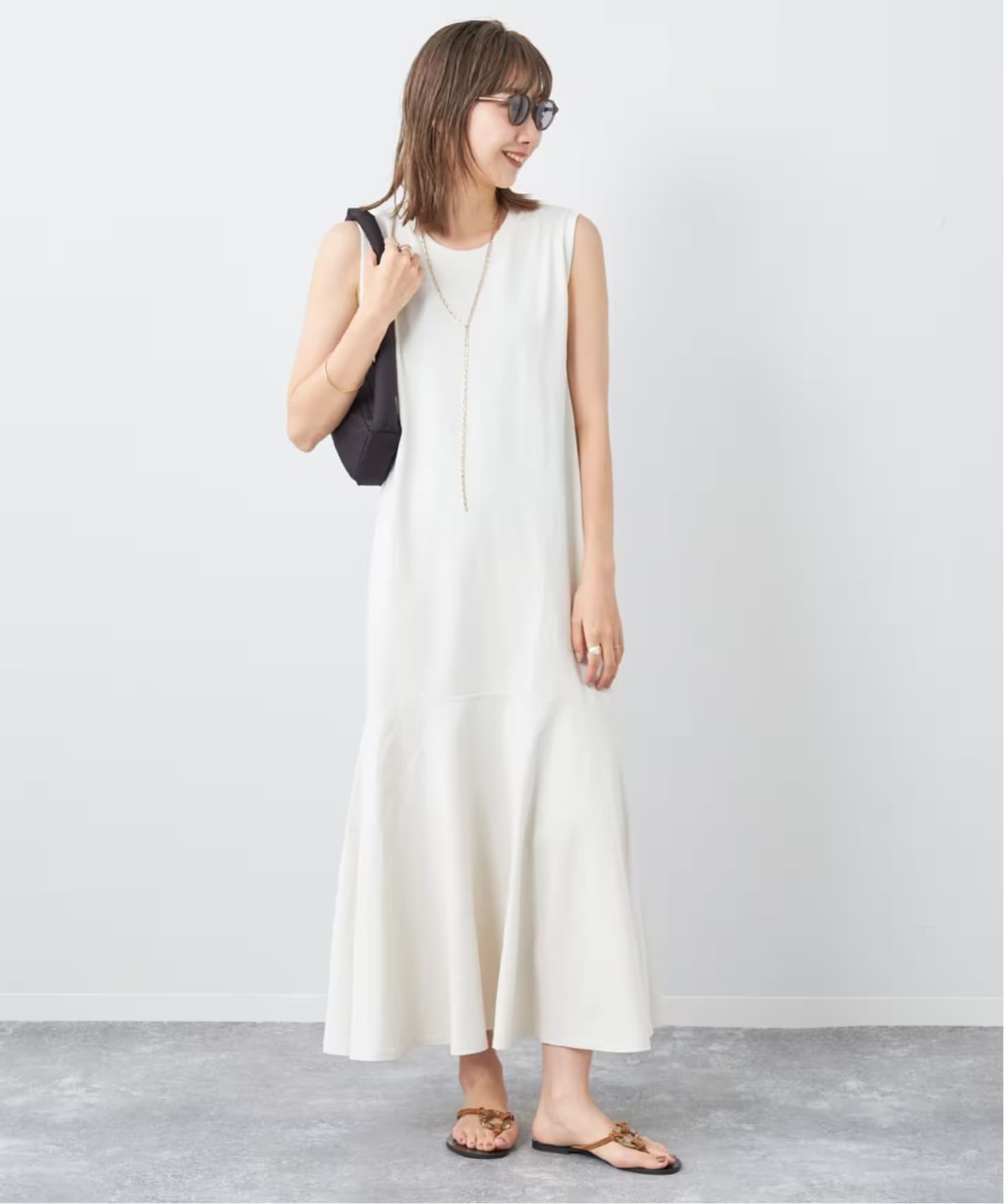 大人っぽくヘルシーにまとうヘルシーな肌見せがトレンドのこの夏は、ノースリーブワンピースもVネックのバックデザインなどが続々。やりすぎない肌見せ具合なのが大人にちょうどよく、潔く二の腕を出すのもポイント。