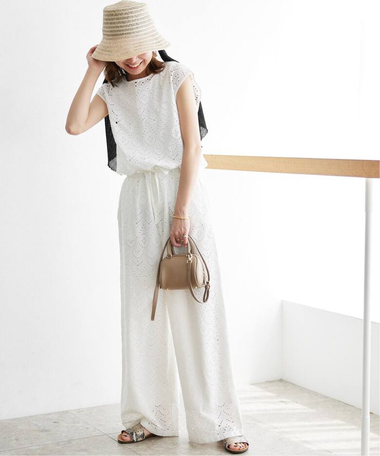 大人のためのオールインワンJOURNAL STANDARD relumeのコットンカットワーク刺繍オールインワンは、1枚で華やかに着映えるエンブロイダリー生地のオールインワン。爽やかなモノトーンが夏にぴったりで、パンツ部分にきちんと裏地が付いているところも高ポイント。