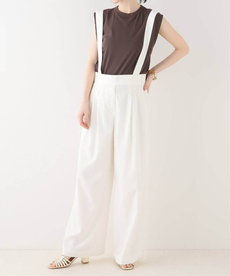カジュアルな抜け感がちょうどいいシンプルトップスと合わせるだけで大人カジュアルコーデが簡単にキマるIENAのユーティリティーツイルタックパンツ。落ち感のあるキレイめ素材と、コーデのワンポイントに効く太めのストラップが好相性。