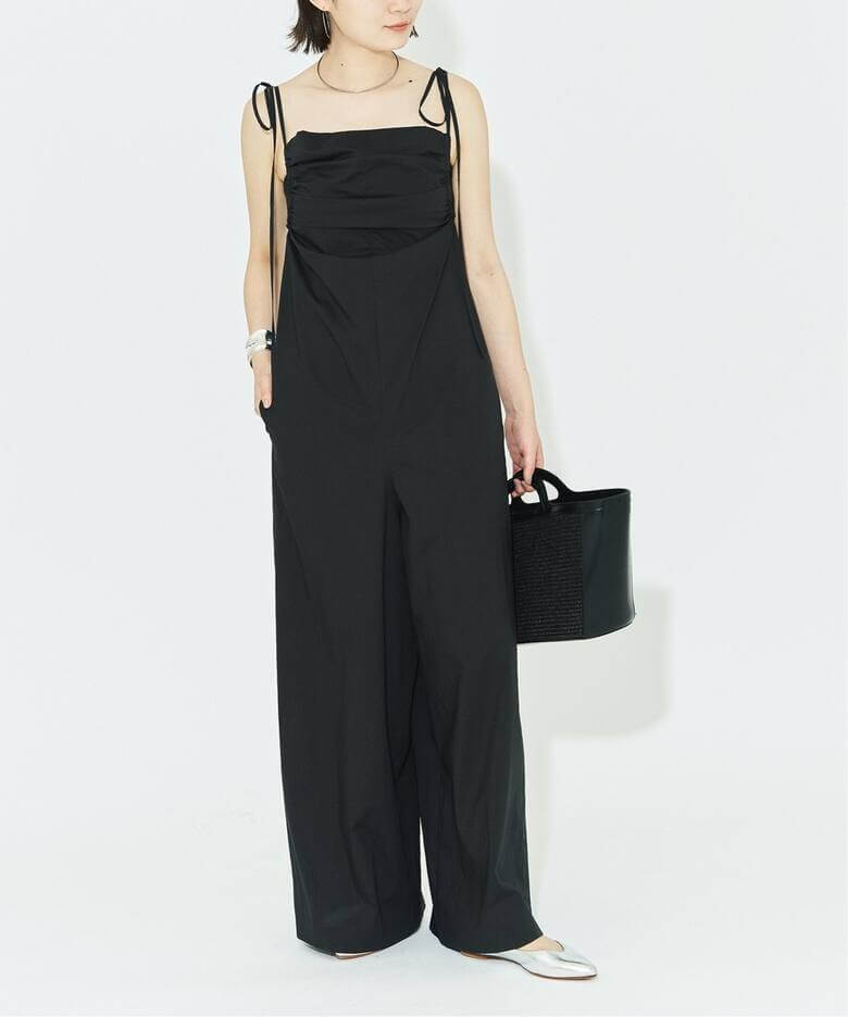 大人可愛い細ストラップマニッシュなオールインワンのスタイルに、華奢なストラップをプラスすることで大人可愛いムードがアップ。HARDY NOIRのタイプライターギャザーオールインワンはヘルシーさと女っぽさが今どきバランス。