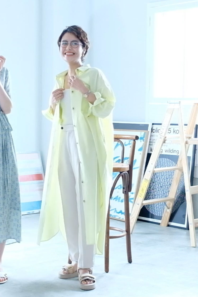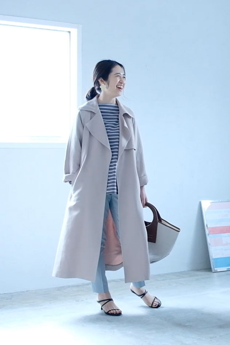 - アウターは、冬から人気継続のオーバーサイズを春仕様にアップデート。心地よい柔らかな素材でゆったりとまとうロング丈のコートが、大人の気品を漂わせながら洗練のムードに導きます。