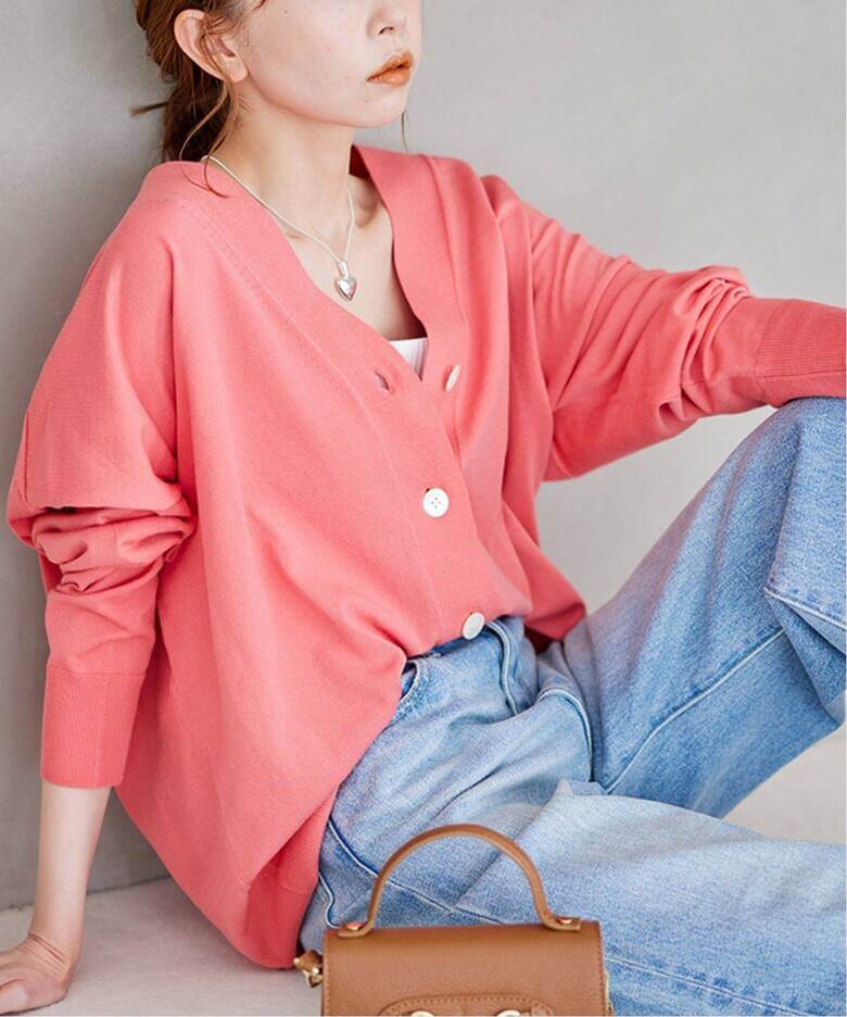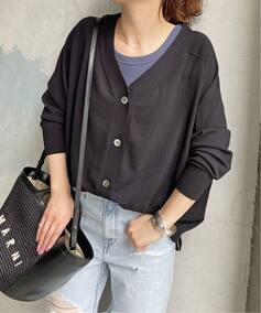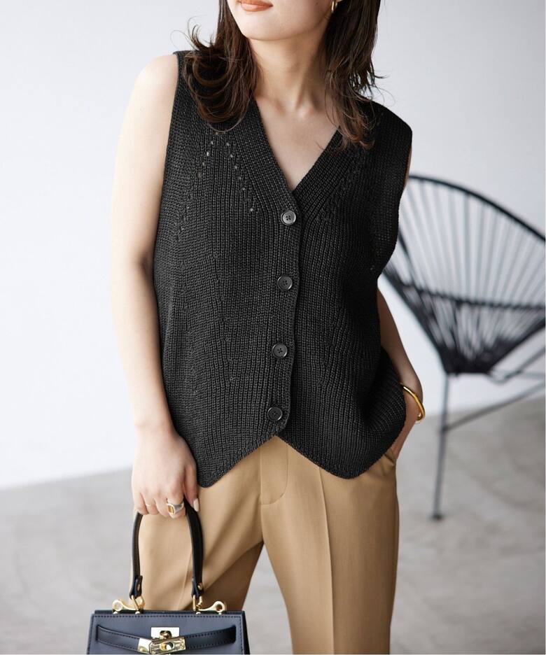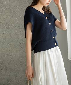 冷房下でもお洒落なレイヤードを外は暑くても、オフィスは冷房が効いていて羽織りものがマスト。NOBLEのNewペーパーヤーンベストは気軽に羽織れる半袖ニット。きちんと感のある金ボタンと程よく抜け感漂うゆるシルエットがグッドバランス。