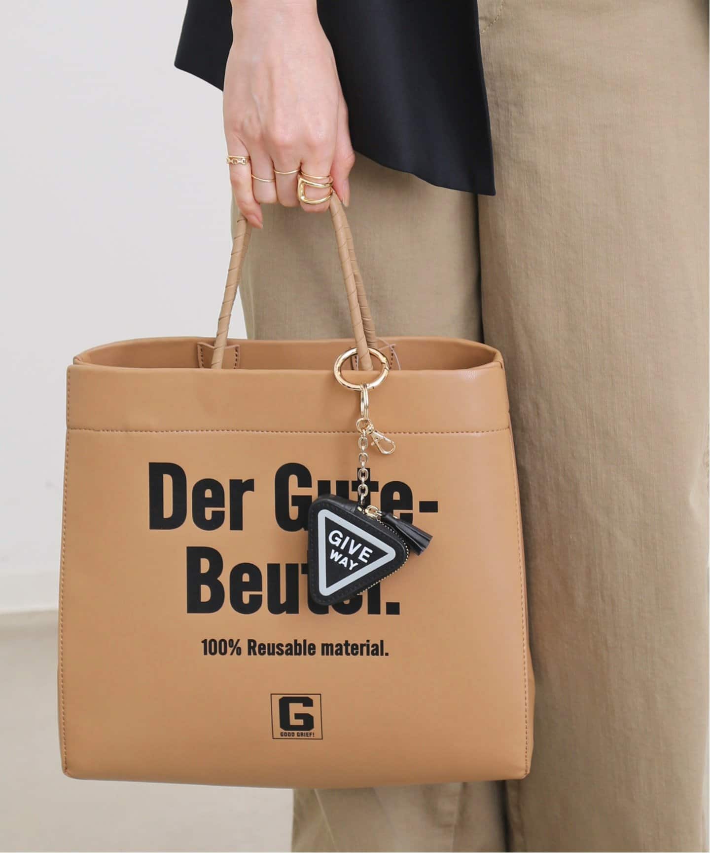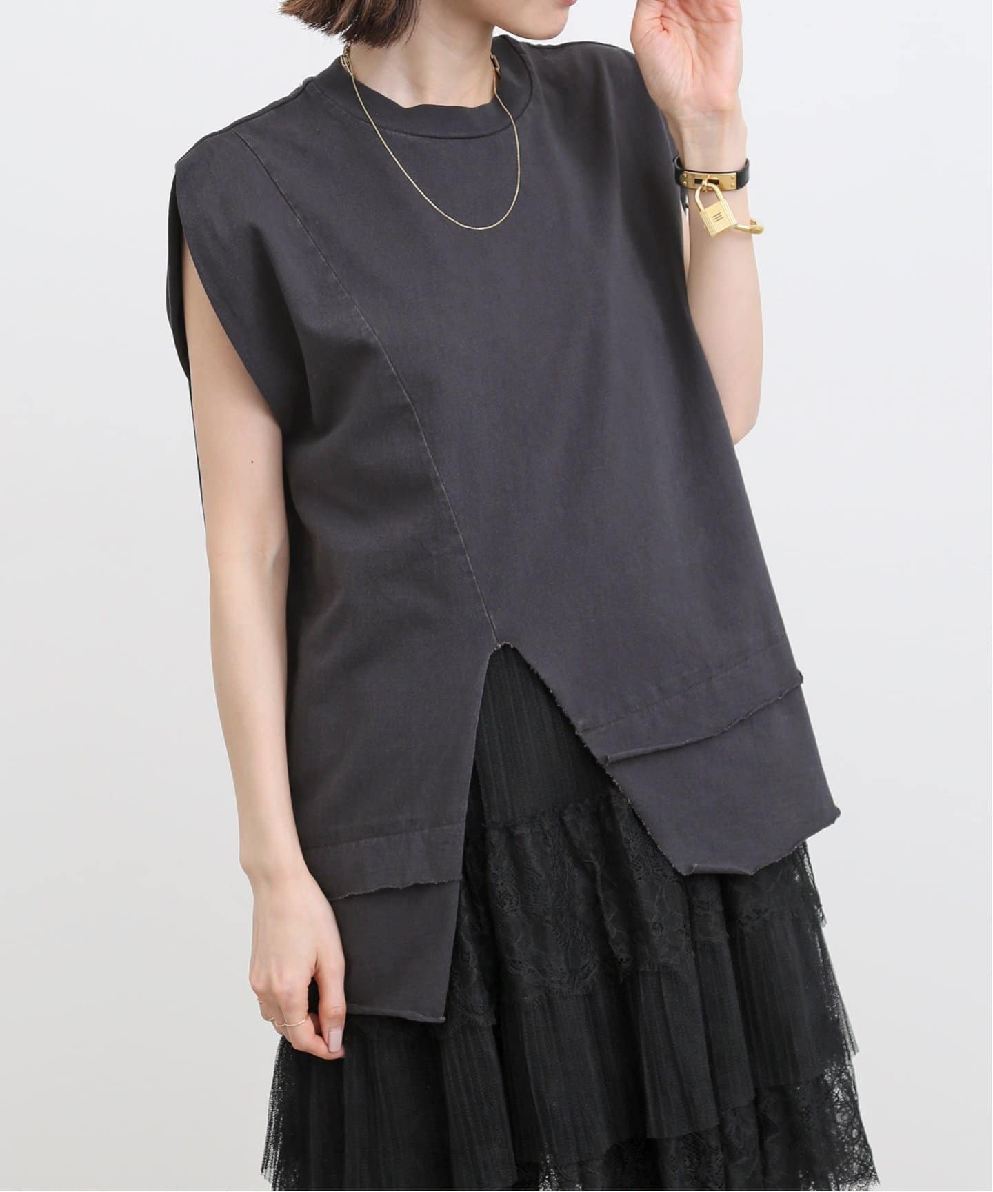 キャッチーな小物にも注目アシンメトリーに入ったスリットがアクセントのR JUBILEEノースリーブカットソーは、パンツともスカートとも相性の良いマルチなデザインでヘビロテ確実。シンプルコーデに加えたいロゴバッグや小物も。