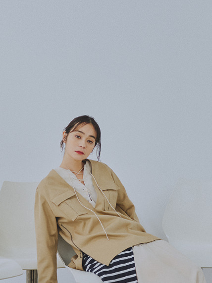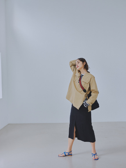 襟元からレースアップがのぞく 絶妙なレイヤードは計算ずく。 腰巻きボーダーをスパイスに