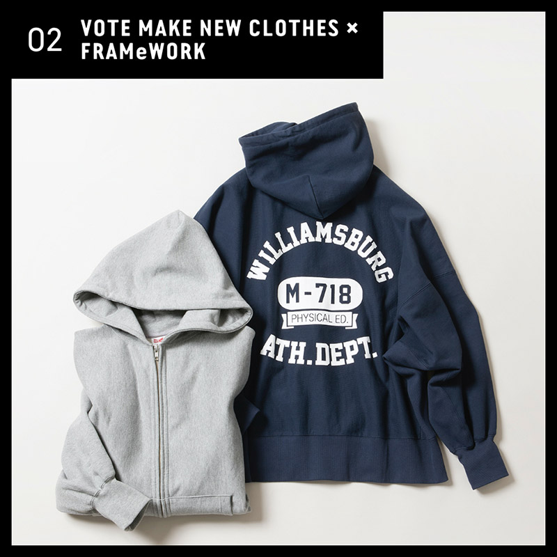 アメカジ風のバックプリントもワンランク上のカジュアルスタイルを叶えてくれるポイント。 - FRAMeWORK【VOTE MAKE NEW CLOTHES】 フルジップパーカー◆¥19,800(税込)