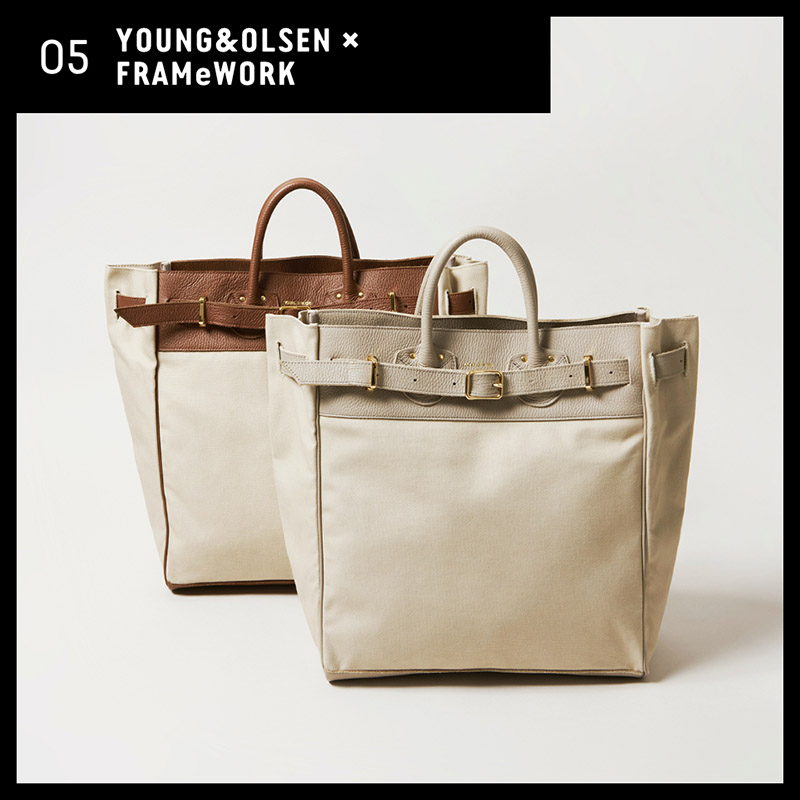 キャンバス地に持ち手がレザーのデザインはカジュアル派、きれい目派、どちらもオススメできる優秀BAG。程よいサイズ感が活躍するシーンが多いのも人気の理由。 - FRAMeWORK【YOUNG&OLSEN】別注キャンバスベルト付きBag◆¥33,000(税込)