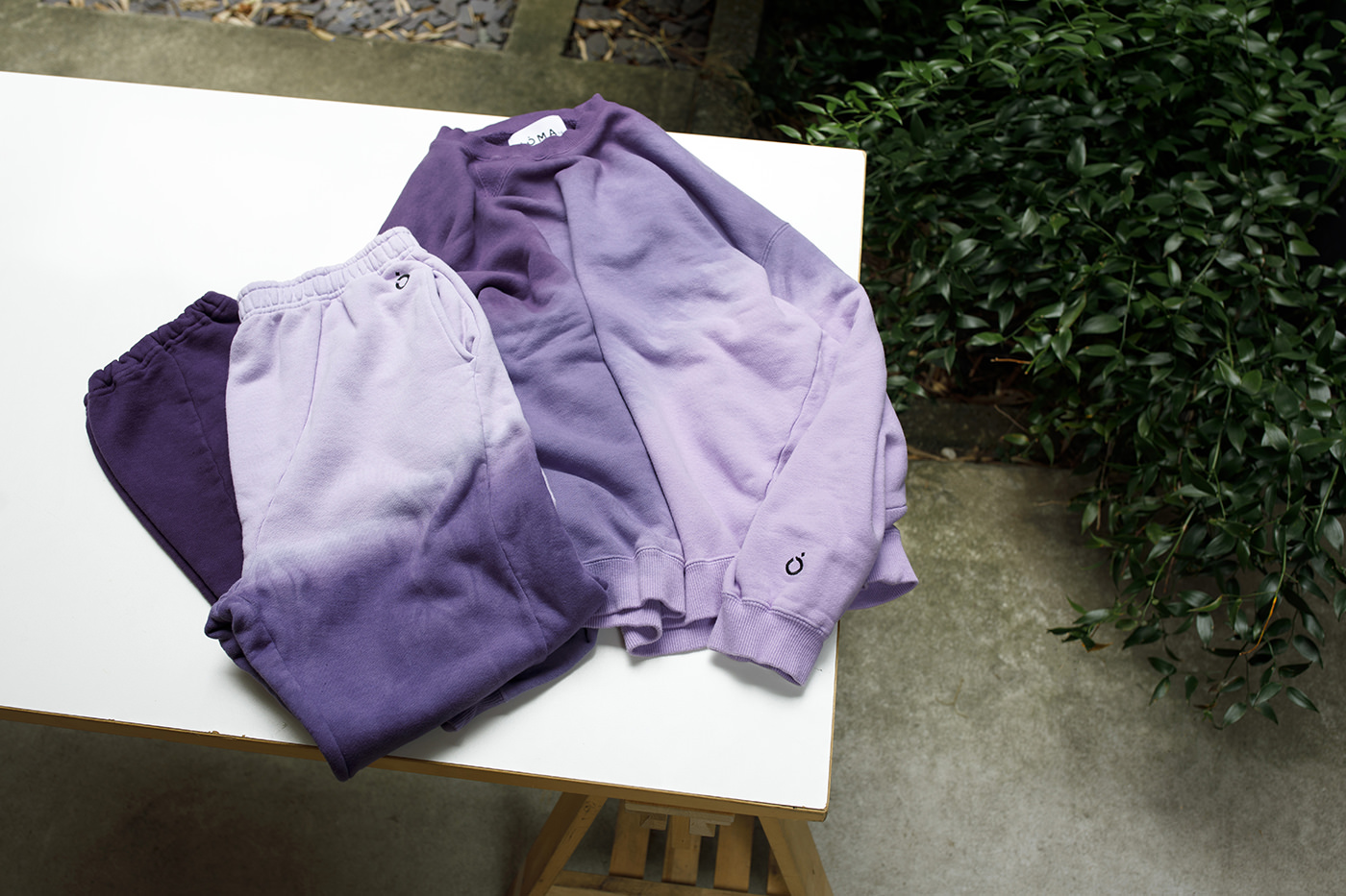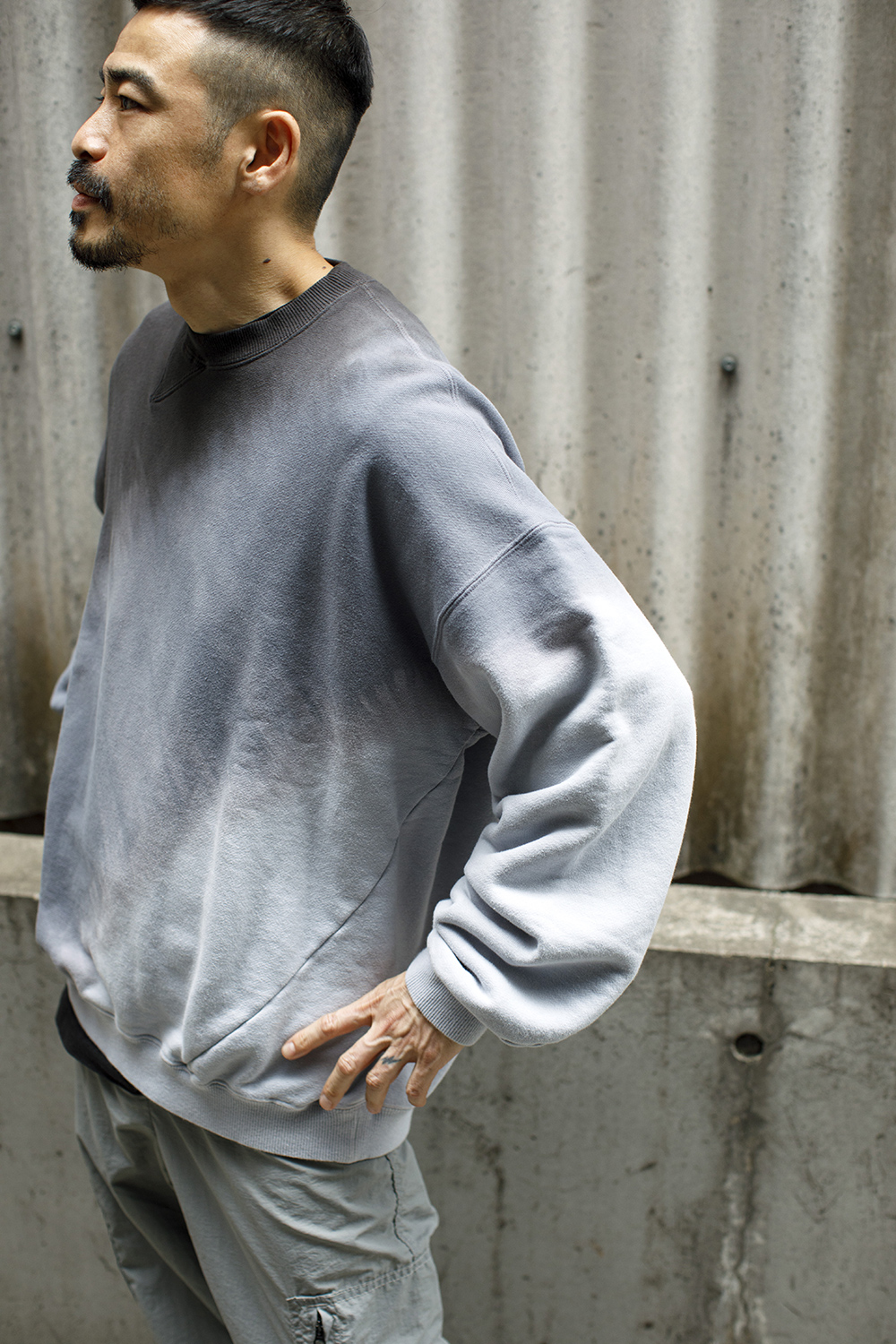 「今回の別注スウェットの染めは、以前NOMA t.d.のインラインにも採用していた技法。当時は裏を染めていましたが、レリュームからのリクエストでそれを表染めにし、別注カラーとしてブラックとパープルをそれぞれグラデーションカラーで作りました。着丈はあえて少し短く、肩がきれいに落ちるようなシルエットに。今季はこのような染めのアイテムをセットアップで提案したいなと思い、同柄のパンツも作りました」(佐々木)